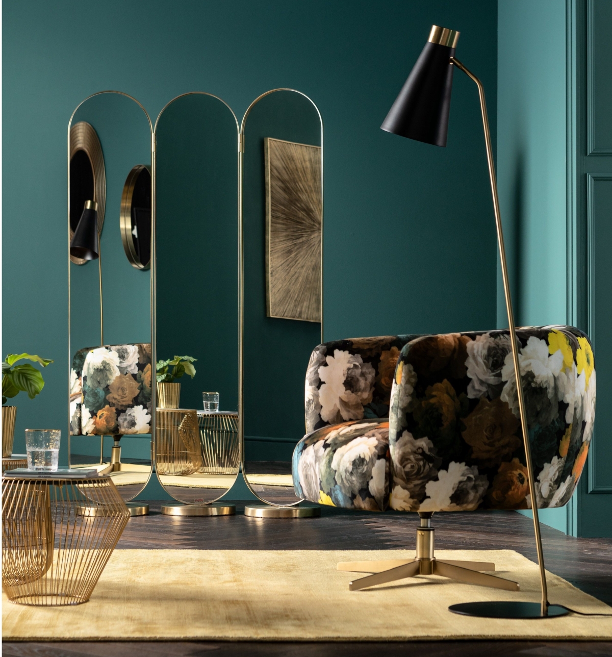 Эта комната отдыха в квартире молодой успешной бизнес-леди оформлена с явным преобладанием минимализма. Интерьер и предметы обстановки выдержаны в прохладных тонах. Сине-зеленые панели стен создают спокойную, умиротворенную атмосферу. В такой же ненавязчивой бледной палитре выполнен импрессионистский рисунок цветущих пионов на текстильной обивке уютного вращающегося кресла Peony Gelb, композиция с бутонами пионов повторяется и на ткани абажура напольной лампы. Ее неяркий свет выделяет цветовой акцент – бежевый однотонный коврик на тёмном паркете в центре комнаты. На этом островке, напоминающем фрагмент полосы песчаного пляжа, размещено кресло. У кресла располагается торшер, черный раструб его рефлектора концентрирует свет лампы на страницах книги или на рукоделии.