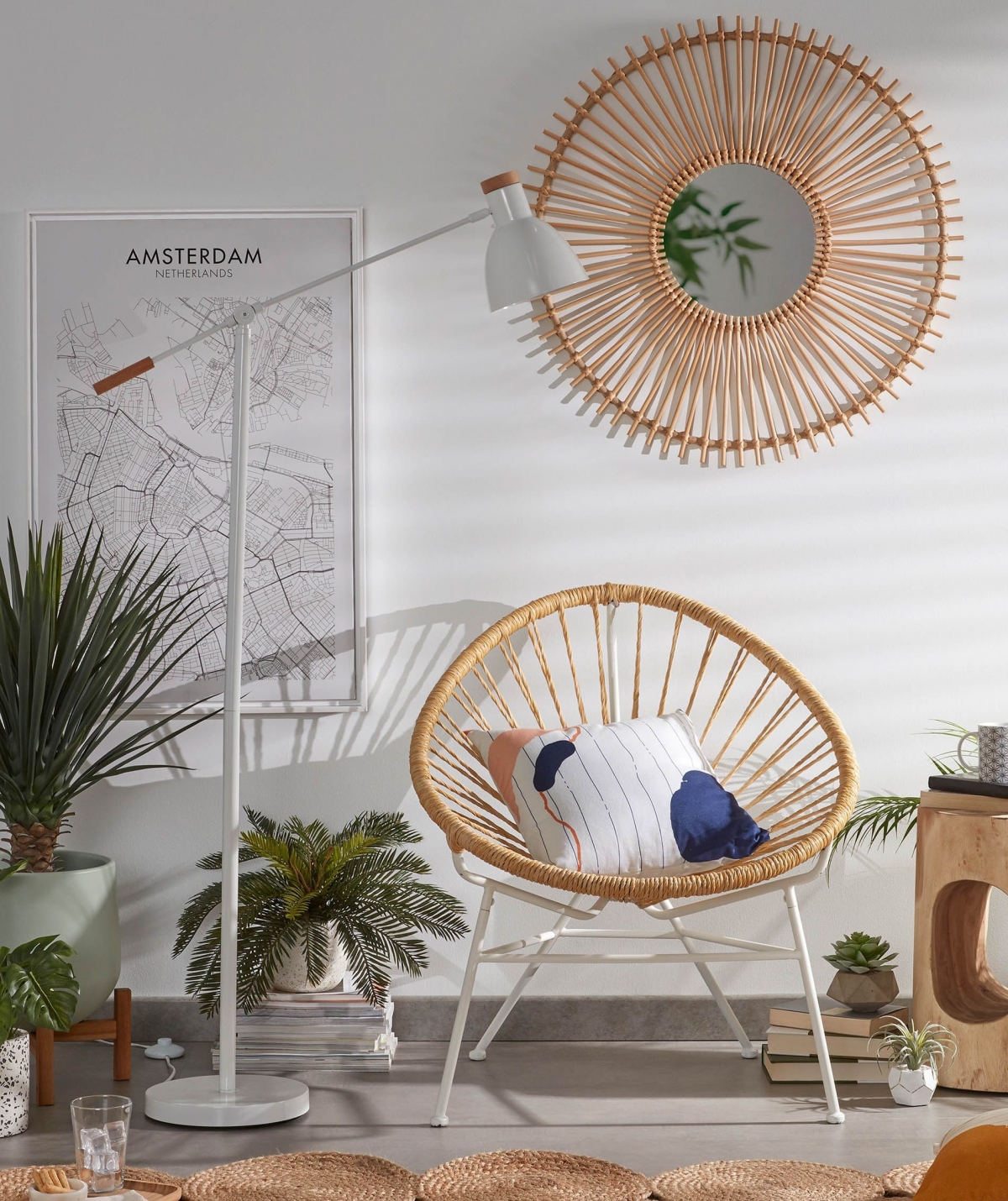 Плетеное бежевое кресло Samantha — удобное, круглое с прочными металлическими ножками. На нем так легко расположиться, накрывшись мягким пледом. Атмосферности интерьеру добавляет и эффектный приставной столик Halker из мунгурской древесины. Выполненный в виде дупла, он органично вписывается в оформление комнаты. «Солнечное» зеркало Louisa в круглой витиеватой раме из натурального ротанга — тандем стилей эко и арт-деко. Схематичный постер на стене, ведущий в столицу Голландии, словно отрицает великолепие золотистого зеркала, контрастирует с ним.