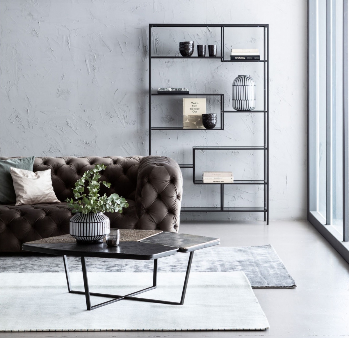 У стеллажа Loft свое функциональное предназначение. Это открытый металлический элемент с прочными и вместительными полками. Настоящее геометрическое «волшебство» в вашей гостиной. Уютным полотном из вискозы и натурального хлопка все в тех же серых тонах укрывает пол стильный прямоугольный коврик.