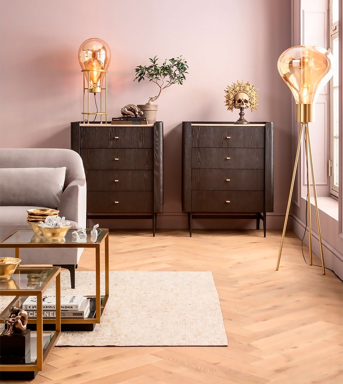 Зачем ограничиваться обычной, ничем не примечательной настольной лампой, если есть возможность купить лампу Pear? Серия Pear станет отличным выбором, и если вы ищете необычный торшер, — напольный светильник на треноге будет шикарным украшением вашего интерьера. Череп с короной, кожаный ковер, сет журнальных столиков — каждым элементом, представленным в этой обстановке, можно любоваться практически бесконечно. Особенно, если решите в это время удобно устроиться на мягком уютном диване Proud, отложив любимую настольную книгу на практичный шифоньер Milano.
