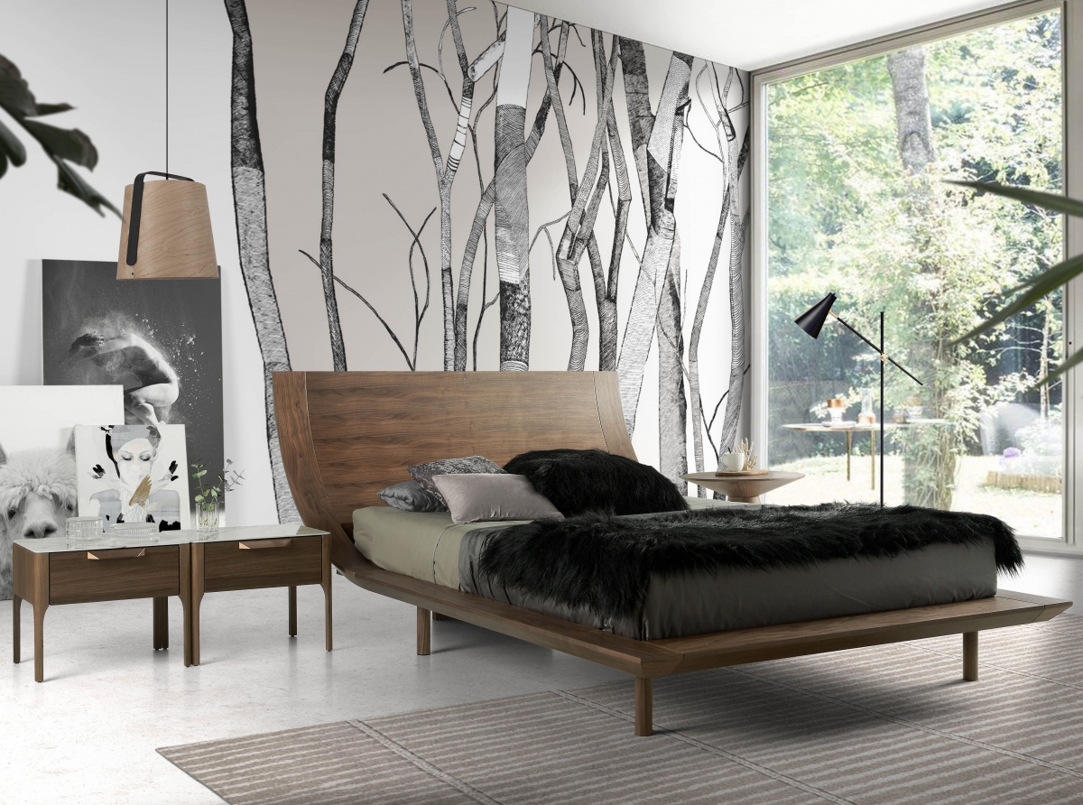 Объединяя благородные материалы и нетривиальные формы элементов меблировки, дизайнеры сделали спальню символом настоящего эко-стиля, отражением спокойствия и элегантности. Особенно сложно скрыть последнюю, ведь насыщенная древесная палитра удачно подчеркивает уют просторной комнаты отдыха. Идеальная спальня для тех, кто ведет здоровый образ жизни и наполняет окружающее пространство исключительно экологичными предметами. Среди них мы видим ультрамодную, кокетливо выгнутую кровать из коллекции Nature Life. Плавностью изогнутой спинки она немного напоминает гондолу, плывущую по тропической реке. К этой же брендовой линейке относится и компактная, но вместительная деревянная тумба с выдвижным ящиком и поверхностью «под мрамор».
