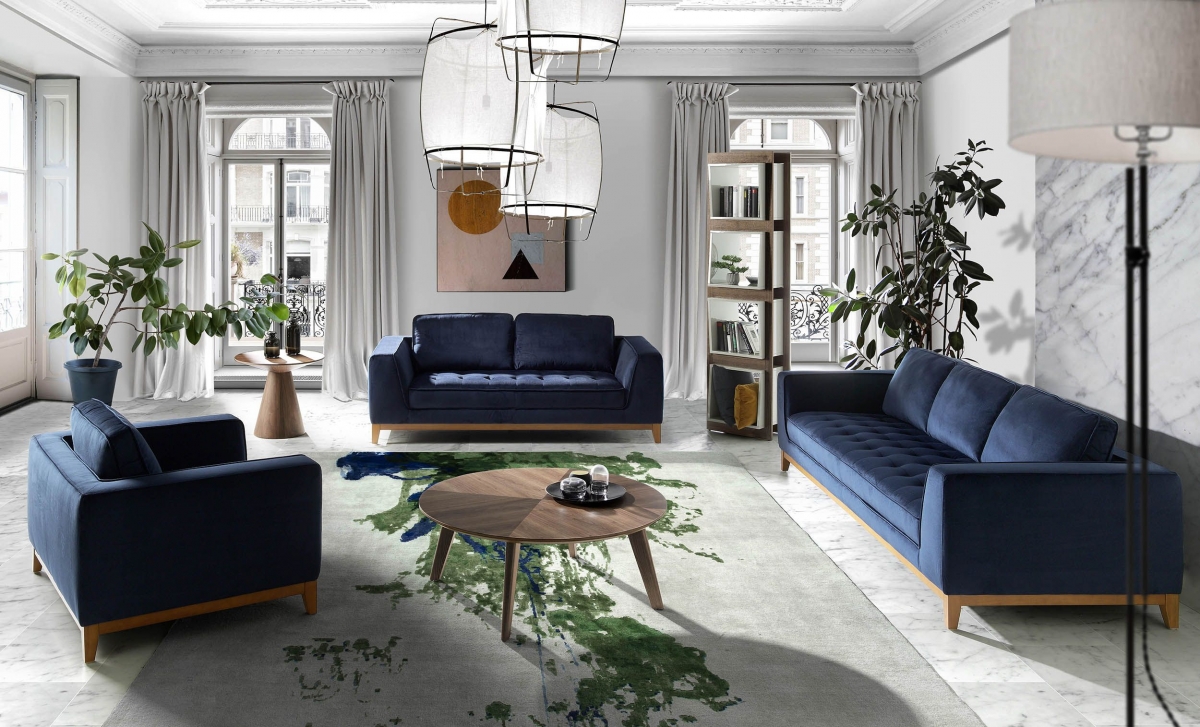 Набор мягкой мебели глубокого синего цвета и основательно-простых форм, легкий, практически воздушный стеллаж, максимально простые кофейный и журнальный столики — это основа интерьера, которая отвечает за функциональность обстановки, комфорт. А за сказку отвечают детали — ковер, на который природа (точнее, дизайнер) выплеснула дорожку мха, воздушные люстры, обитые парусами, зеленые растения в крупных кадках, оригинальные вазы, напоминающие баночки в сказочной избушке, на журнальном столике. Вы можете продолжить эту картину, нанеся на нее свои мазки.