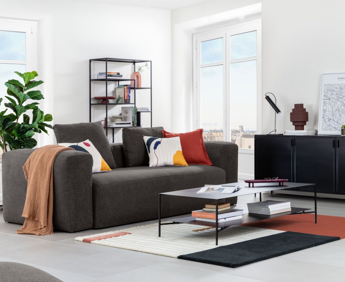 Монументальная простота серого дивана разбавляется воздушной ажурностью стеллажа и кофейного столика. Шерстяной ковер и настольная лампа, напоминающая небольшой телескоп, — штрихи, которые превращают просто удачный интерьер в обстановку со своим характером. И дальше вы уже можете творить сами — выбирайте подушки-статуэтки-постеры, чтобы гарантированно насладиться полученным эффектом.