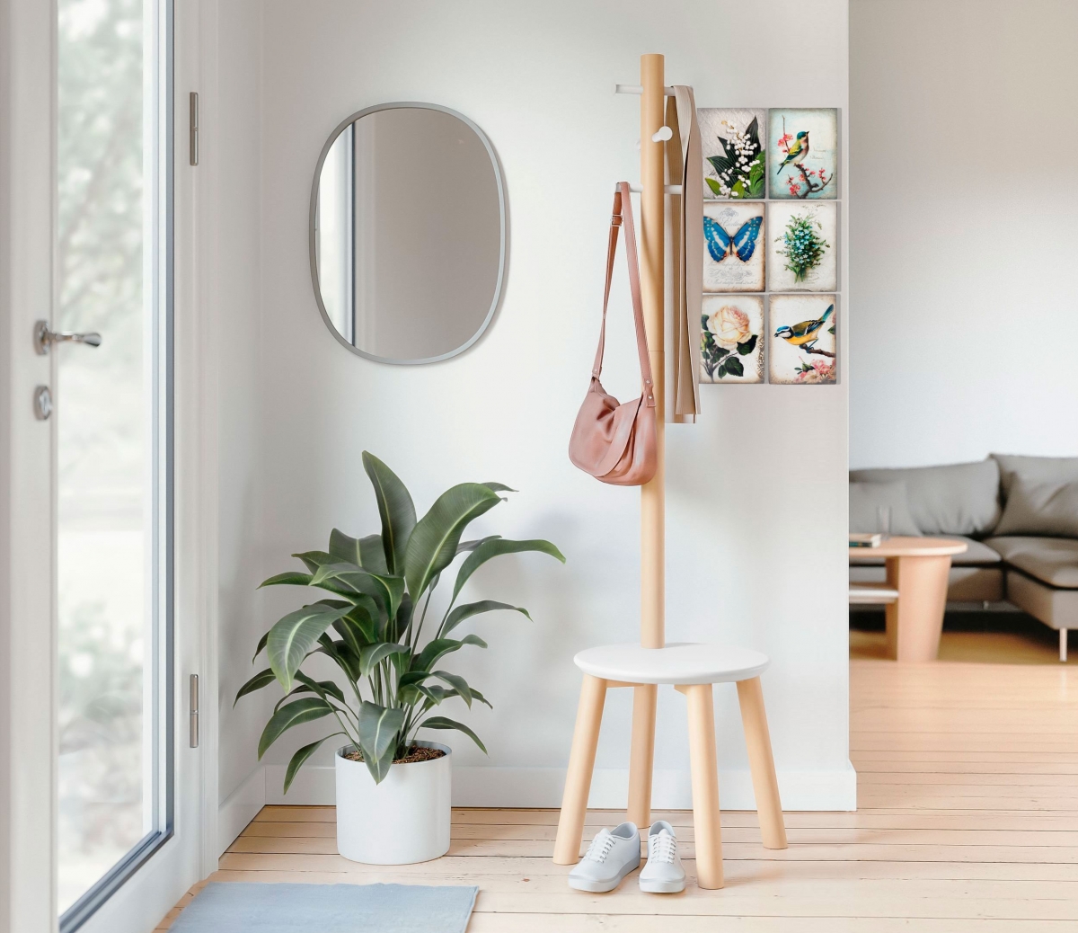 Прихожая по праву считается лицом дома, по которому формируется первое впечатление о нем. И представленный интерьер — это сочетание стиля, практичности и функциональности. Овальное зеркало в лаконичной раме безупречно сочетается с напольной вешалкой, оснащенной подставкой с сиденьем, которое позволяет с удобством и комфортом снимать и надевать обувь.