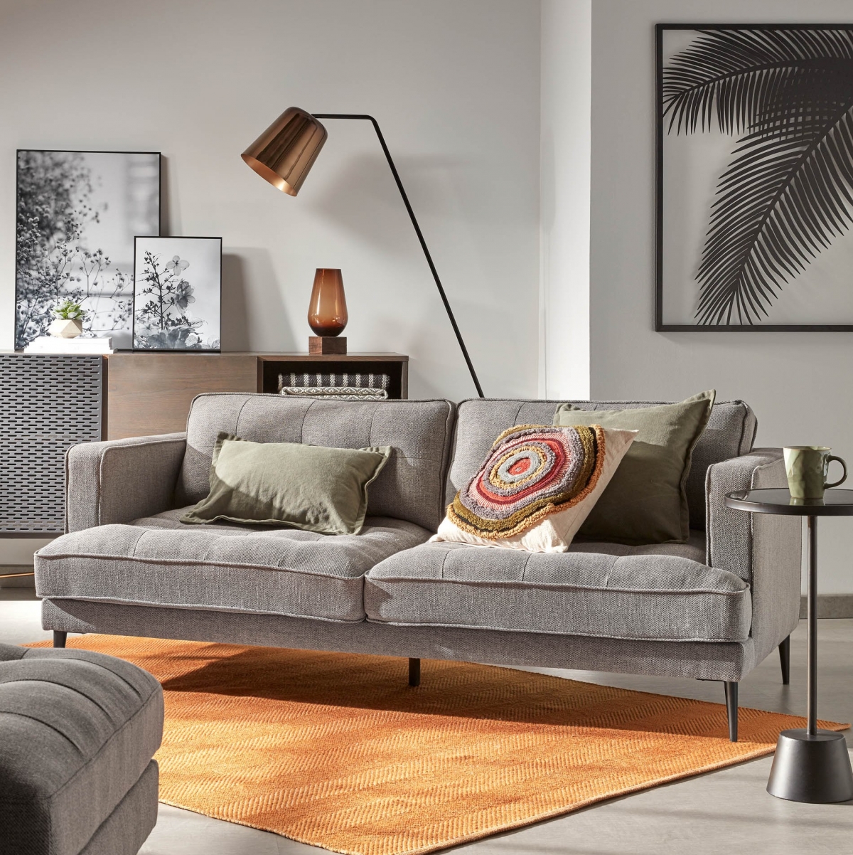 Лаконичный и стильный интерьер для гостиной, в котором главная ставка сделана на оформление комфортной и удобной зоны отдыха. Она представлена трехместным диваном в благородном сером оттенке, который отличается классической формой и выраженным объемом спинки и подушек в сочетании с тонкими ножками. Мягкое, рассеянное освещение обеспечивается торшером с металлическим абажуром. Свет торшера идеален для отдыха, чтения, просмотра тв или общения с близкими и друзьями.