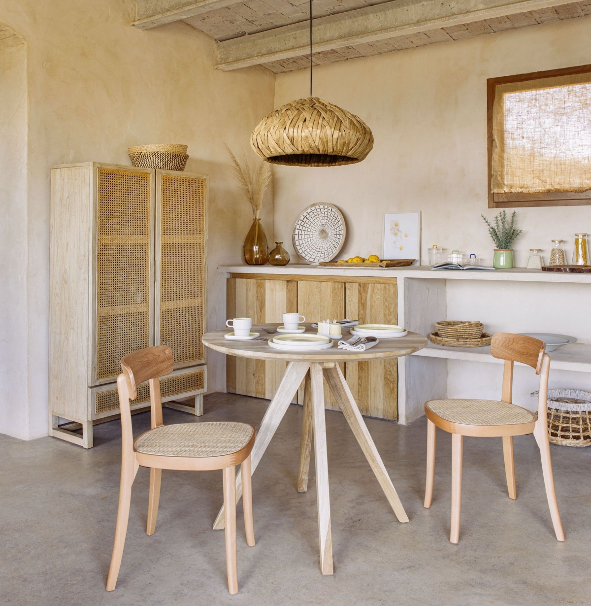Небольшой круглый обеденный стол из тика и простые стулья из массива бука — основа интерьера, вокруг которой выстраивается обстановка. Буфет из дерева минди отлично вписывается в общую стилевую композицию и делает интерьер более практичным, функциональным. И, конечно, куда без декоративных элементов? Ведь именно они делают обстановку такой приятной, тёплой и уютной. В декоративной вазе Brenna отлично будет смотреться букет полевых цветов, а в плетеной корзине Ment вы можете хранить, фрукты или овощи.