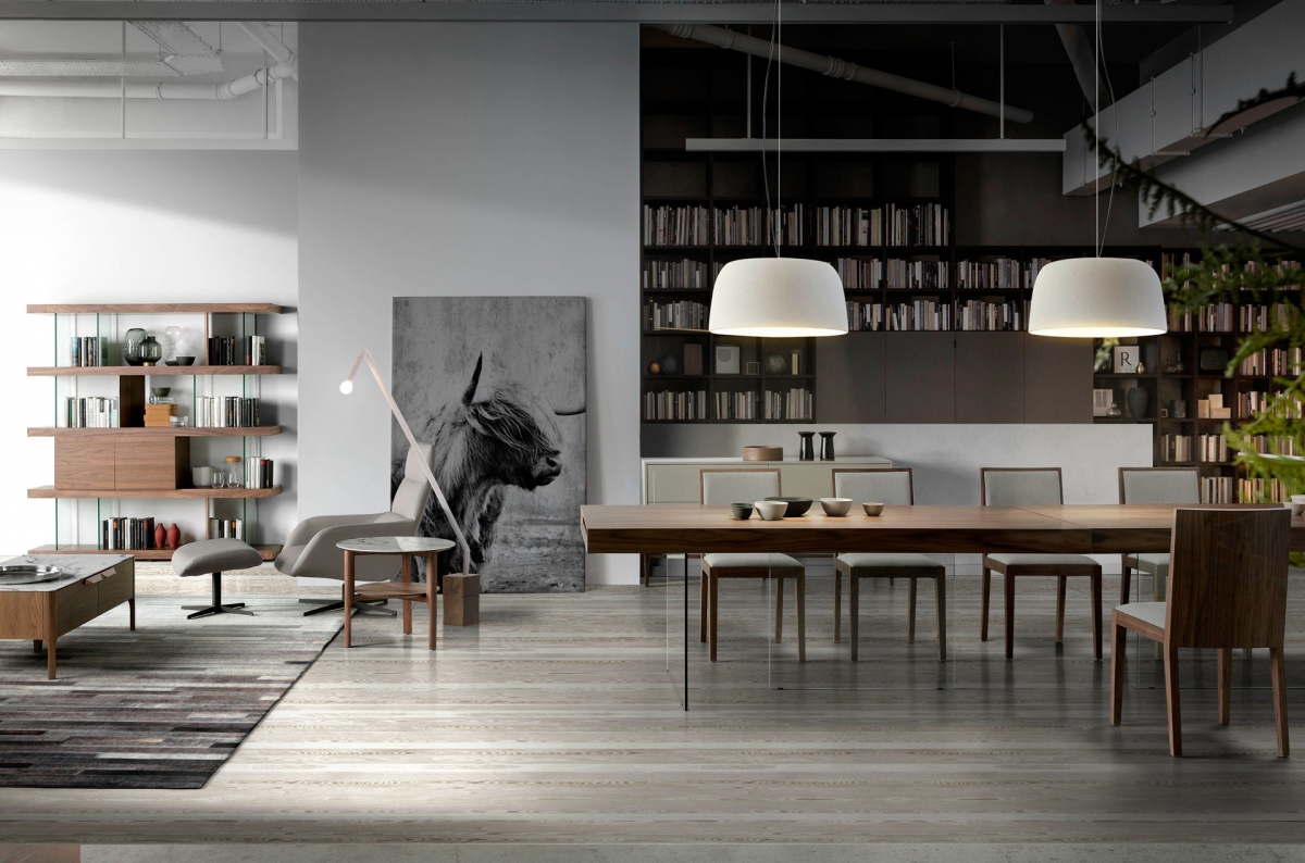Зона отдыха гостиной оборудована стеллажом, журнальным и вспомогательным столиками из коллекции Nature Life бренда Angel Cerda. Предметы имеют простые классические формы и естественную расцветку натурального массива ореха. Декор столешниц “под мрамор” придает ансамблю еще больше красоты и благородства. Специально под него в дополнение к столам было выбрано удобное кресло Solid с обивкой “под кожу” перламутрово-бежевого цвета. Один взгляд на этот интерьер дарит ощущение стабильности и покоя, уголок идеален для умиротворенного чтения, просмотра телевизора или занятия хобби.