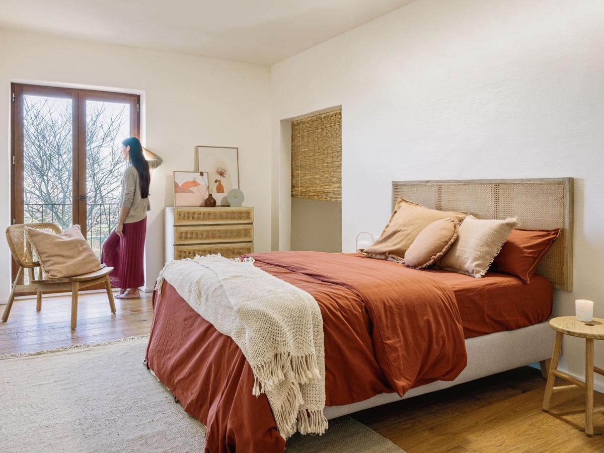 В центре внимание большая кровать на ножках с изголовьем из редкого природного материала — дерева минди. Её «товарищ» миниатюрный, но вместительный шифоньер с тремя ящиками тоже выполнен из идентичной древесины. Аккуратный и лаконичный табурет из эвкалипта завершает пастельный ансамбль. Но интерьер уютной спальни не перестает удивлять текстильными атрибутами, которые представлены декоративными подушками, жемчужным мягким пледом, ковриком из джута, хлопка и шерсти. Светлая палитра — воплощение естественных красок. Это одно из лучших решений для спальни, в которой царит гармония. Если же вам захочется присесть и поразмыслить перед сном, воспользуйтесь стильным креслом из тика и ротанга. Панорамное остекление впускает много света в помещение, но вы можете оградить его с помощью жалюзи или рулонных штор в пастельной гамме.