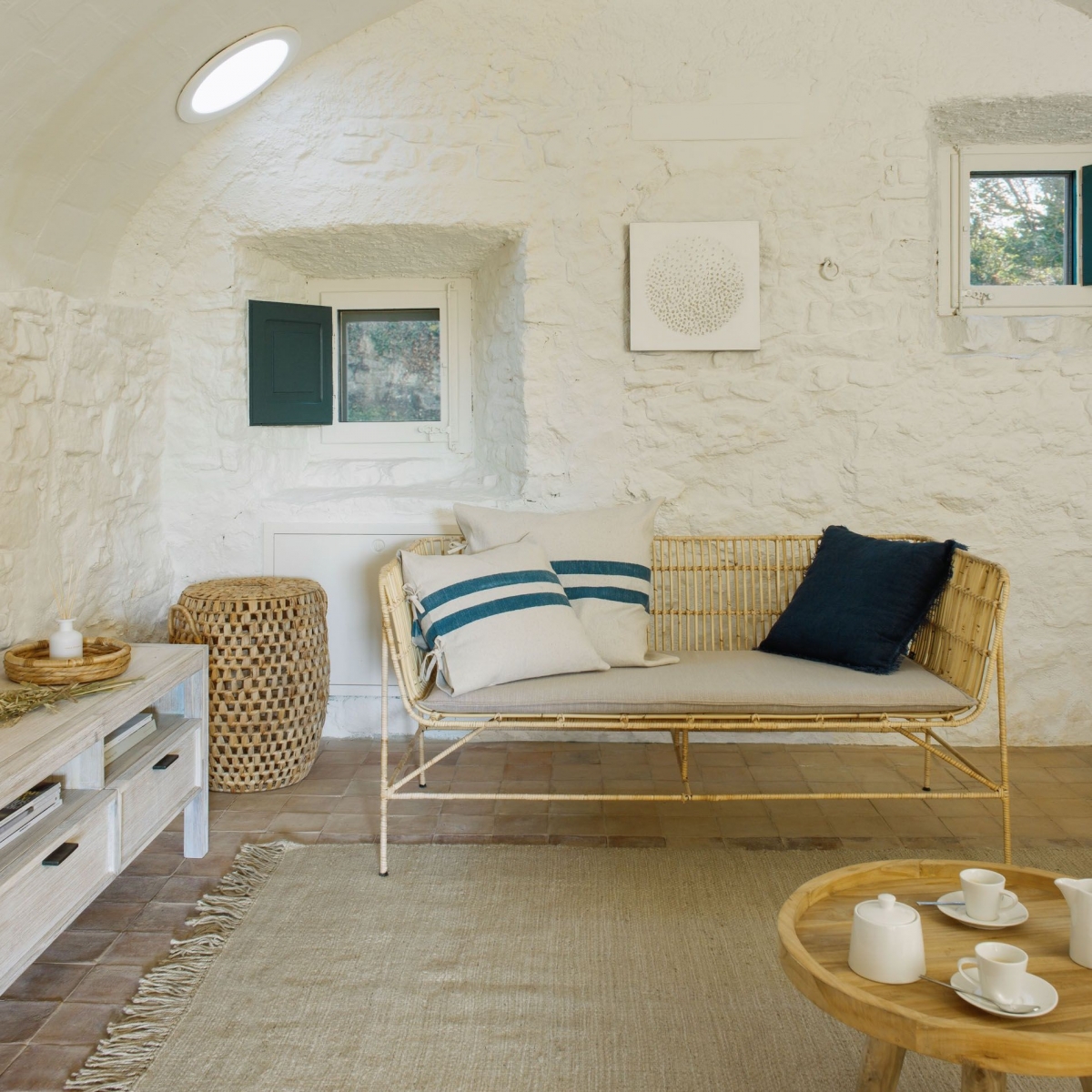 Пшеничные оттенки безудержно преобладают в интерьере этой гостиной. Выбеленные стены своей бледностью и оригинальной фактурой подчеркивают принадлежность того, кто любит проводить время в этой комнате, к творческой профессии. Плетёный диван рассчитан на два места. Он не обременяет интерьер, но отличается функциональностью за счет практичной графитовой подушки. Натуральные мотивы и светлая палитра свойственны и эстетичной плетёной корзине для белья.