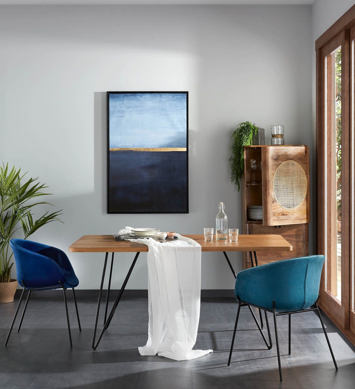 Стол Komme и буфет Geraldine стали центральными стилеобразующими элементами этого ансамбля. Неокрашенная древесина, ее четкая и местами чуть “состаренная” текстура, простота традиционных форм предметов мебели превращают пространство в настоящую “лачугу” моряка. Эффект закрепляют очаровательный фасад буфета с круглым окошком, заделанным соломенной сеткой, и красноречивый постер Wrigley. Очень уместно и при этом современно, свежо смотрятся в интерьере синий и бирюзовый стулья Yvette. Оживляя комнату, они не противоречат ее стилевому единству. Универсальная прозрачная ваза Juliana вносит в матовый интерьер яркие блики, а золотистая полоска на ней сочетается с таким же элементом на постере, поддерживая гармонию.