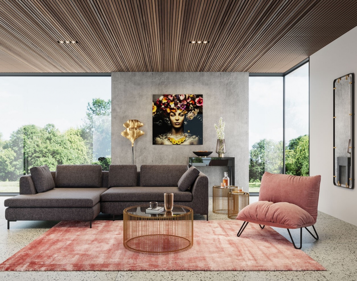 Интерьер создан не просто для того, чтобы радовать глаз ценителя, но и создавать при этом уютную атмосферу. Приставные столики отлично гармонируют с дизайнерским торшером, создавая оттенок оригинальности. Постер на стекле дополняет этот эффект.
