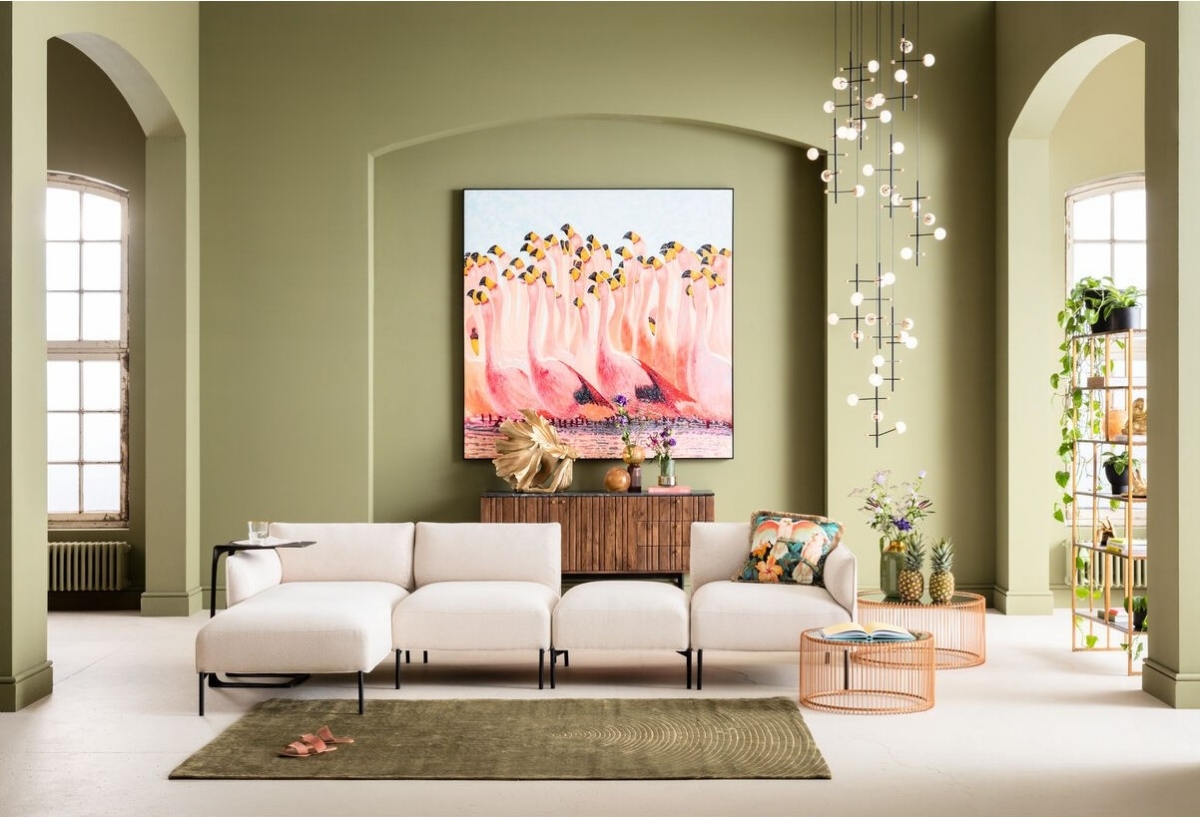 Просторная гостиная в европейском стиле отражает идиллическую концепцию комфорта и романтики. Пастельные, кремовые, глубокие оливковые и персиковые оттенки дарят ощущения уюта. Гостиная не загромождена лишней мебелью и предметами декора — все нужное, все на своих местах. По центру вальяжно расположился удивительно мягкий модульный диван в светлых тонах. Он вместительный и комфортный, замечательно подходит для приема гостей, дружеской компании или уединения. Объемная, плотная текстильная обивка высокого качества и черный каркас на ножках — модули можно менять местами, объединять по вашему усмотрению. За диваном «притаился» слегка состаренный буфет — винтажный, коллекционный, уникальный. Он темно-коричневый, с оригинальной «полосатой» фактурой. Этот буфет создает контраст для светлой мягкой мебели.