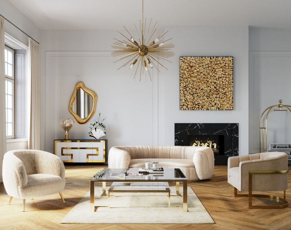 Мягкая мебельная группа в комнате включает округлый диван и пару мягких кресел на золотистых ножках и геометрическом основании. Кремовая палитра слегка сжатой обивки выглядит благородно и изысканно. В центре отливает золотым металлом мини-столик, а на заднем плане с комфортом расположился идентичный по оформлению и оттенкам буфет. Сочетание мягкого золотистого и темно-коричневого цвета подчеркивает высокий статус дизайнерских предметов меблировки. Буфет стал надежным пристанищем лаконичной по форме и богатой по «содержанию» настольной лампы. Это акцентный атрибут цвета жидкого матового золота. Продолжением и завершением концепции арт-деко стал уютный напольный коврик — фактурный, светлый, из натуральной мягкой кожи.