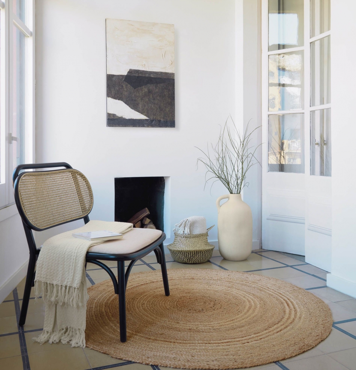 На полу уютный коврик из джута натурального цвета. Круглый функциональный предмет декора выглядит стильно, но непритязательно. Дополняют интерьер большая античная керамическая ваза молочного цвета и дизайнерские плетеные корзины с ручками. Ничего лишнего нет в спокойном интерьере комнаты творческого индивидуалиста.