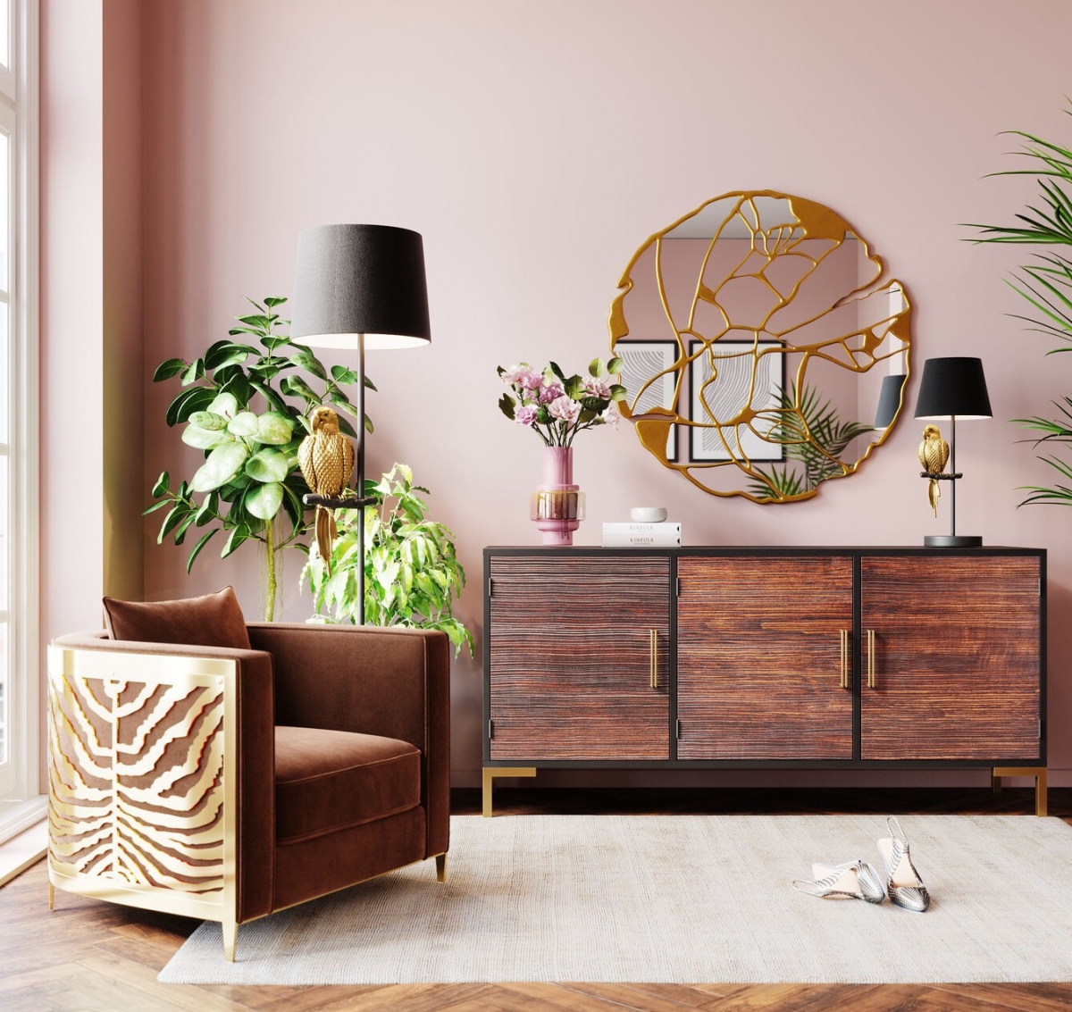Необычное декоративное зеркало Pieces, словно спаянное из витражных стекол золотом солнечного света, имитирует мираж пустынного оазиса. Смело снимайте обувь, чтобы дать отдых уставшим ногам на мягком как песок вискозном ковре Gianna. Остается только достать из винтажного буфета Olbia высокий бокал, чтобы наполнить его любимым напитком и предаться фантазиям о грядущих путешествиях в дальние страны.