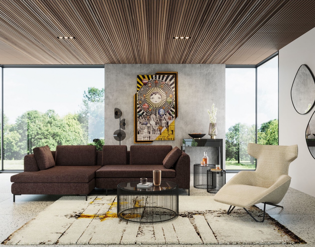 Стиль авангард в просторной, комфортной, многозадачной гостиной отчетливо прослеживается в интерьерных деталях. Мебельная группа — настоящий символ комфорта и практичности. Дизайнерский диван с вместительным канапе в бежевом исполнении с теплым подтоном отлично вписывается в интерьерную концепцию. Зеркальная консоль категории люкс отливает серым металлом, а пастельное кресло для отдыха может похвастаться эргономичной, анатомической, продуманной конструкцией. Оно напоминает низкий лежак на черном каркасе.