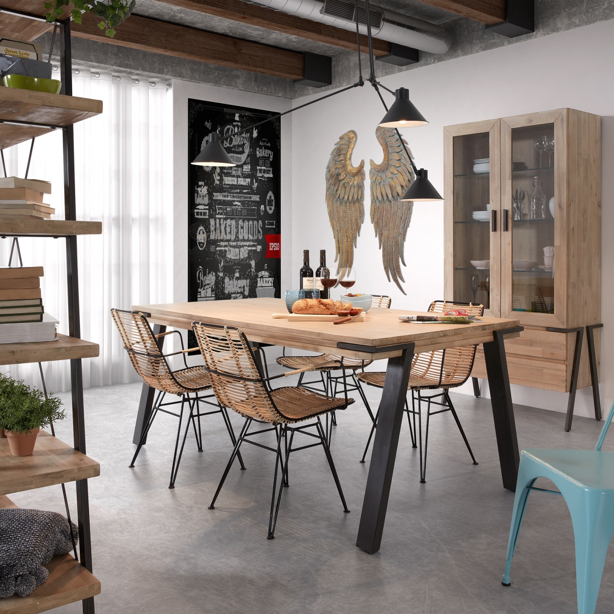 Плакат, стилизованный под меловую доску, и настенный декор в виде крыльев придают столовой нотки творчества, а лаконичный светильник с тремя лампами идеально сочетается с железными ножками стола.