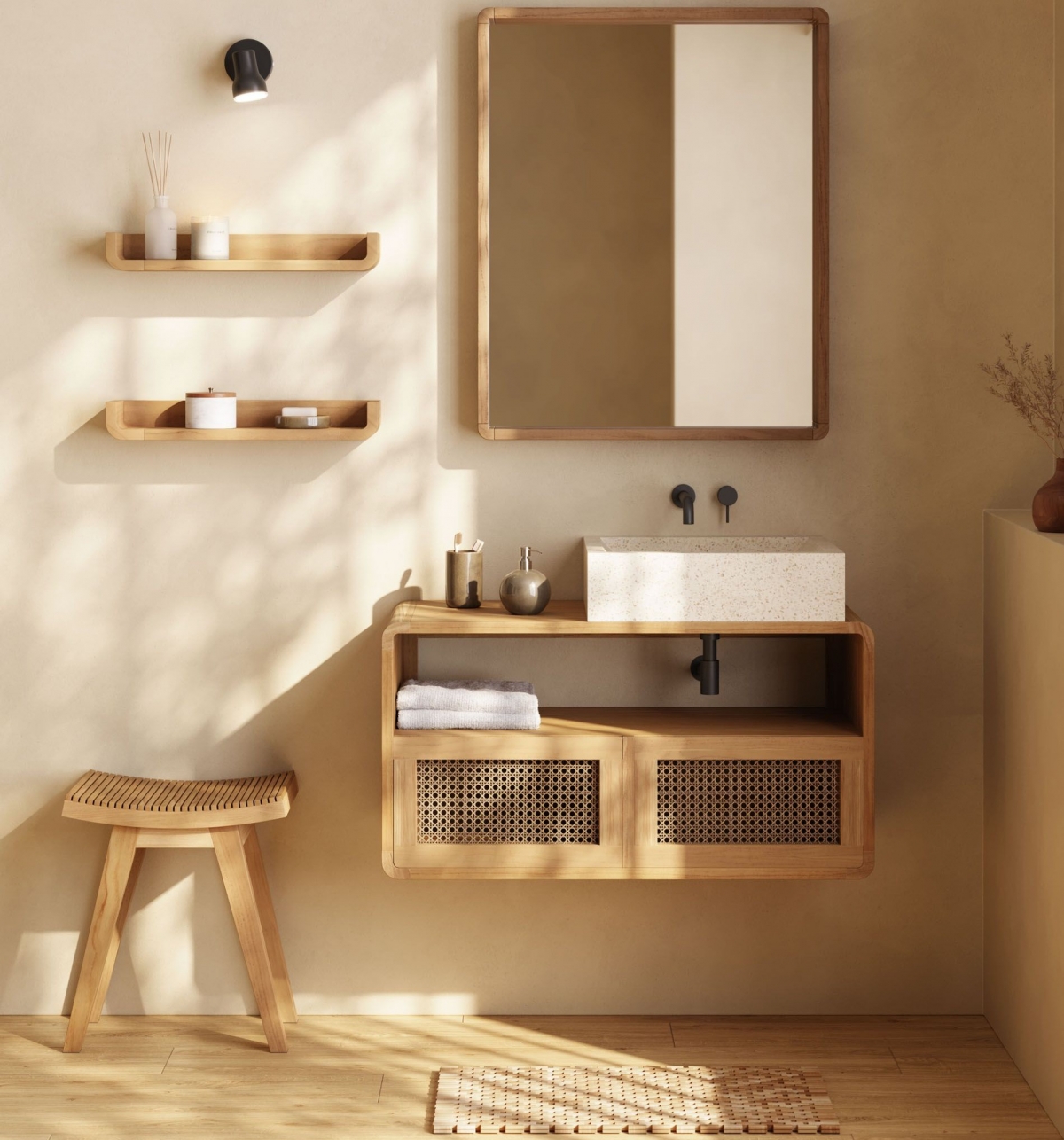 Деревянный табурет из тикового дерева имеет необычную форму и идеально сочетается с навесной тумбой. А завершает композицию неординарный коврик – и он тоже из тика!