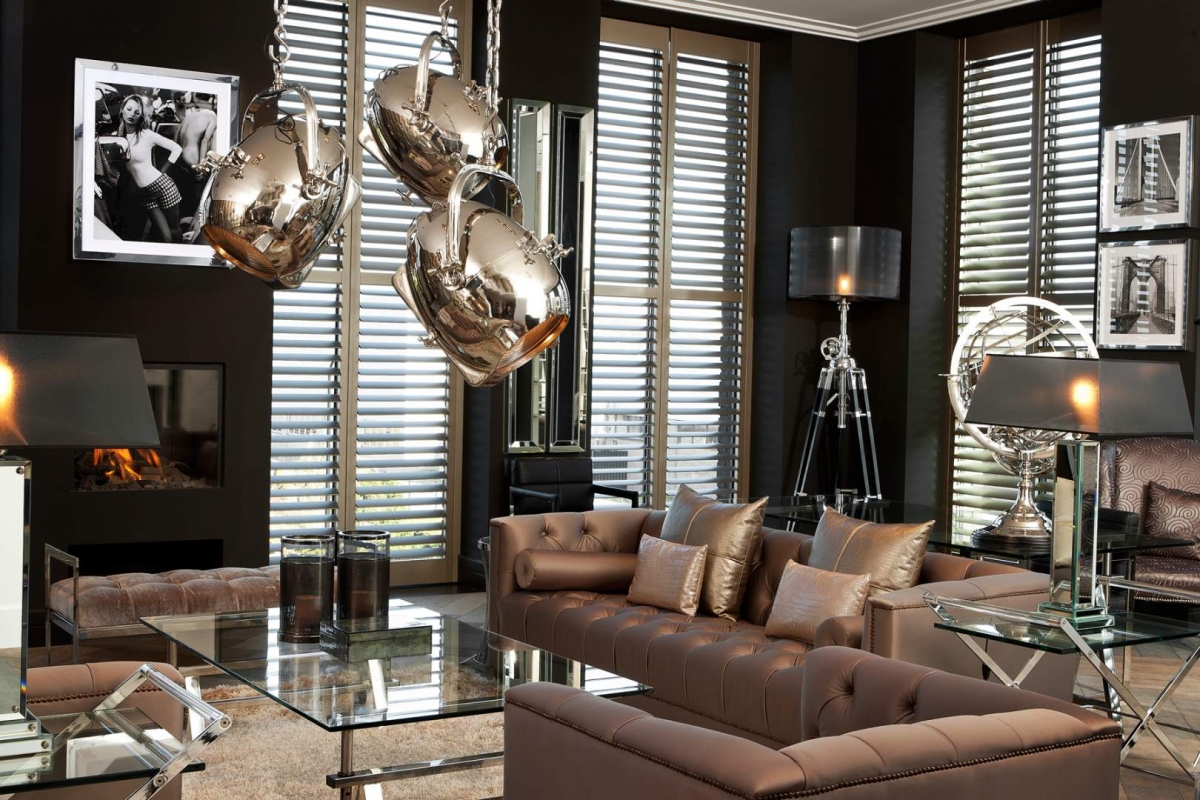 Главная роль в этом интерьере отведена деталям. Классическая мебель темно-коричневого и черного цветов создает прекрасный фон, на котором хромированные элементы выглядят еще ярче. Необычные подвесные светильники приковывают к себе внимание и становятся центром всего образа помещения. Под стиль светильников подобраны сервировочные столики, которые можно с легкостью перемещать из одного угла помещения в другой благодаря колесикам.