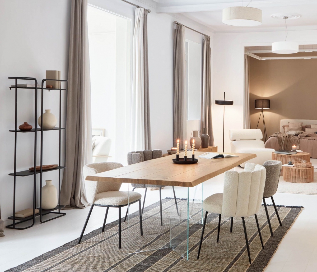 В данном интерьере приверженность скандинавскому направлению прослеживается в каждой детали – дизайнерском дубовом столе на стеклянных ножках, комфортных стульях с мягкой обивкой, практичном стеллаже и лаконичных светильниках. Неизменным спутником стиля служит простой, но оригинальный декор, представленный вазами, свечами и текстилем. Скандинавские мотивы отражаются в применении напольного ковра из шерсти с хлопком. О любви хозяев к расслабляющей атмосфере свидетельствует и зона отдыха, включающая удобное кресло и круглые журнальные столики.