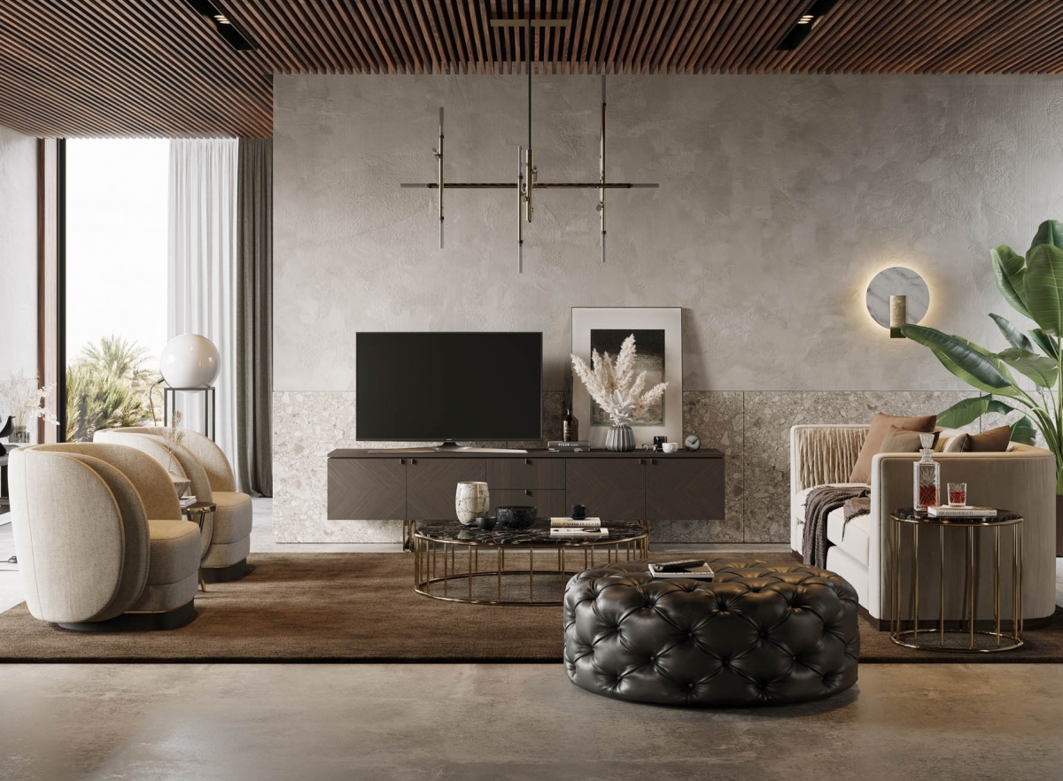 В данном интерьере минимализм прослеживается в холодных отделочных оттенках, грамотно сочетающихся с бежево-коричневыми тонами обстановки. Удобные кресла и диван, строгая тумба и кофейный ковер напоминают о сдержанности и простой геометрии, присущих направлению. Дизайнерские журнальные столики, круглый пуф и изобилие текстиля отражают стремление владельцев к комфорту и полноценному отдыху.