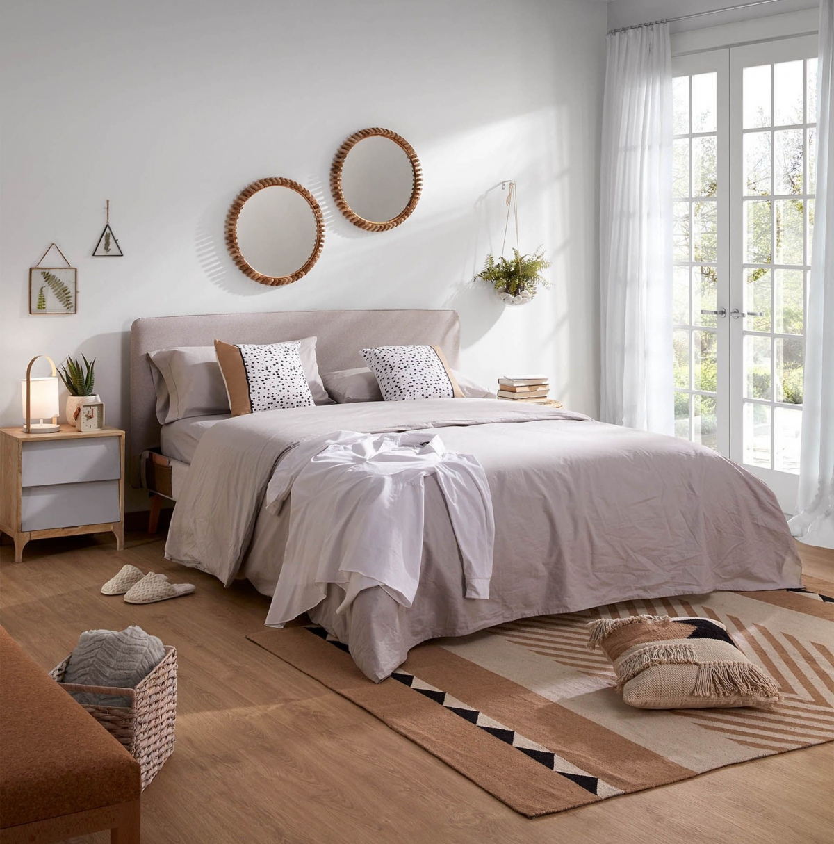 Удобство и красоту интерьеру придают дополнительные элементы. Корзина Woody служит стильным местом хранения необходимых вещей, настольный абажур Zayla мягко освещает пространство и всегда находится под рукой. Цветной акцент в комплекте создан с помощью текстиля. Ковер Galery и наволочка Natalie на мини-подушке выделяются мягкой коричневой расцветкой, этническим принтом и выразительной текстурой. Аксессуары - кашпо Leonie, пара зеркал Polke и рамка для гербария Dawn - придают облику спальни уникальности, свежести и стиля.