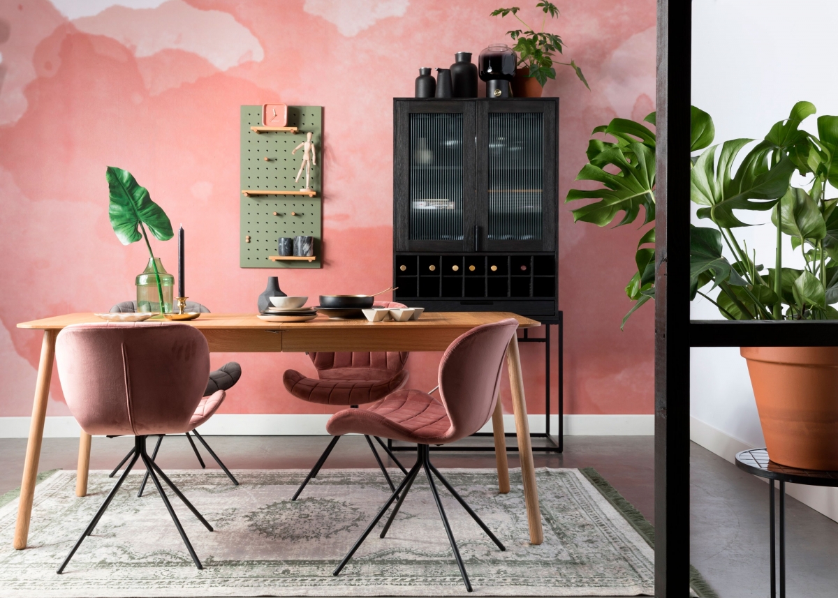 Основной акцент сделан на цвете, и это – розовый. Необычные обои, выполненные в этом оттенке, создают чуть мечтательное и праздничное настроение. Им в тон подобраны удобные стулья OMG Velvet, обитые нежно-розовым бархатом. Только представьте себе, какие они мягкие и комфортные!