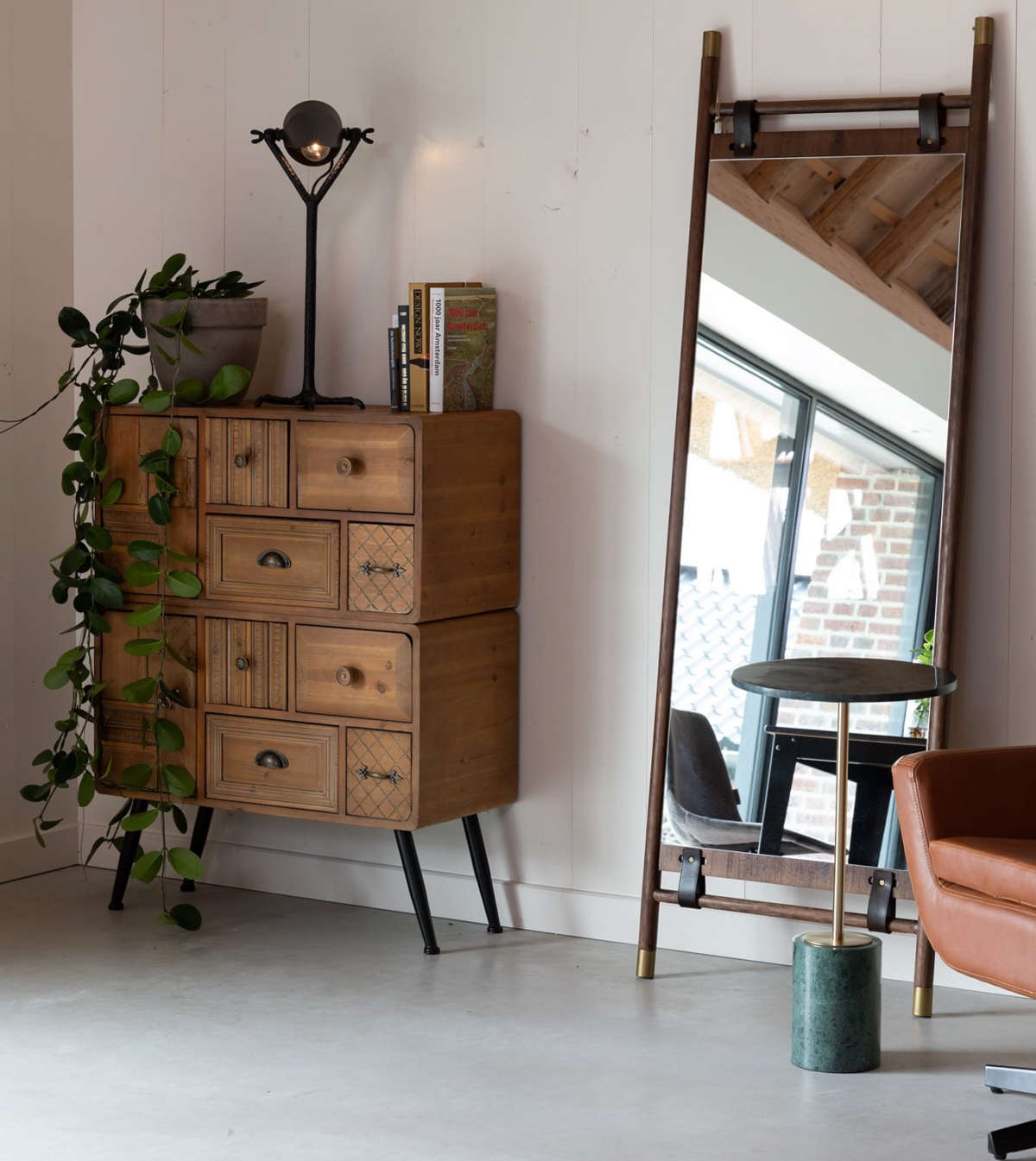 Большое напольное зеркало Riva помогает визуально расширить пространство помещения, а благодаря своей деревянной оправе и декору в виде чёрных кожаных ремешков идеально сочетается и с комодом, и с лампой. Мраморный столик Gunnar изумрудного цвета разбавляет монохромную цветовую гамму и как бы приглашает с удобством расположиться в коричневом кожаном кресле, взяв с комода одну из книг.