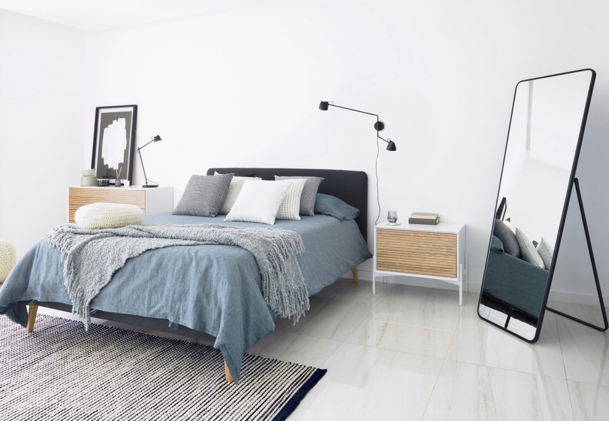 Двуспальная кровать Lydia - довольно широкая. Однако, минималистичное оформление и светлые ножки придают ей изящества. Комод и тумбочка Marielle вмещают в себя много вещей, помогая поддерживать порядок. Благодаря облицовке из натурального массива акации они выглядят дорого, модно и стильно, украшая собой интерьер.