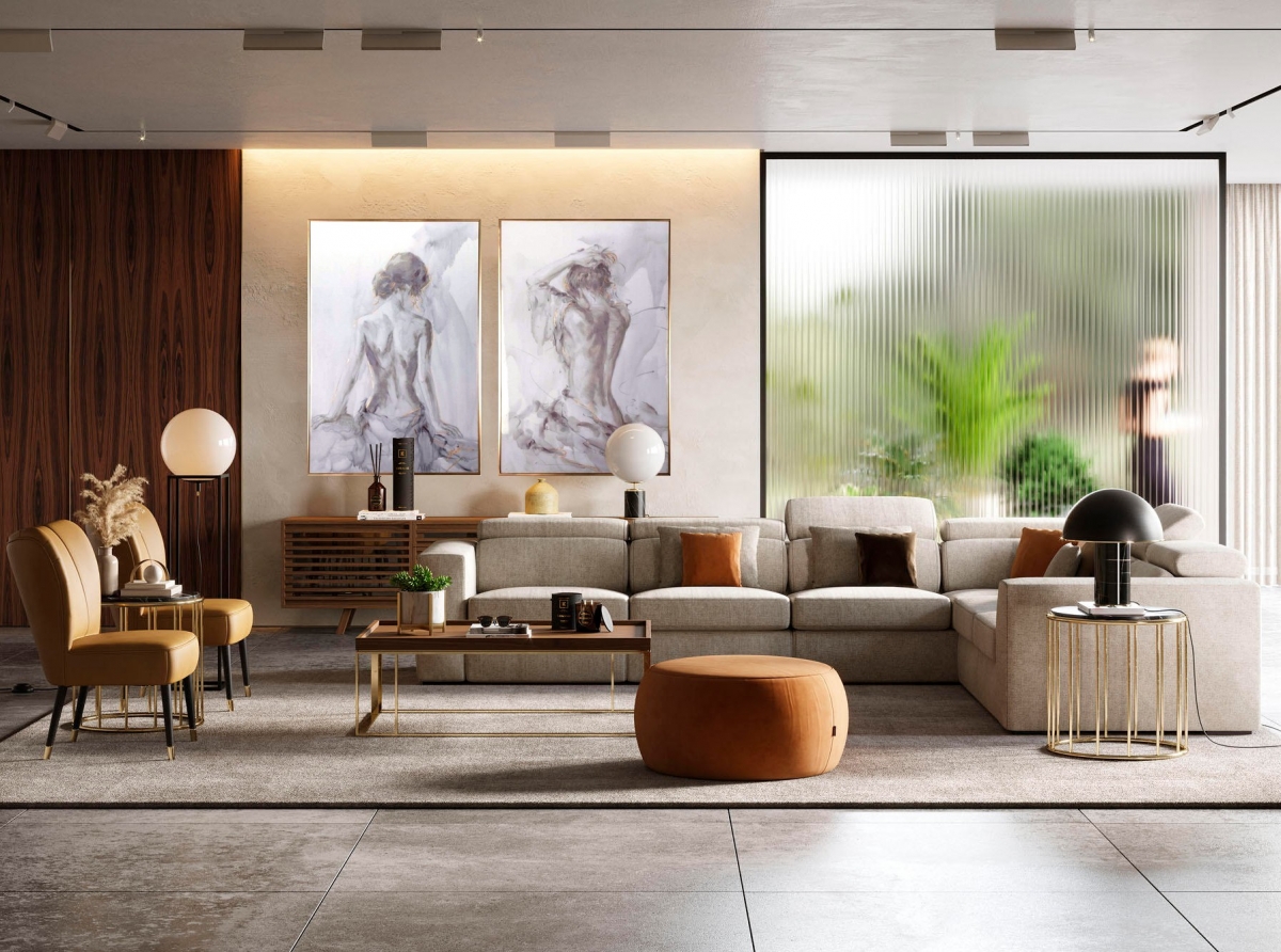 Ключевые позиции в комнате — у мягкой мебели. Большой угловой модульный диван со светлой текстильной обивкой — практичный и солидный «корабль» в этой «гавани». Его окружают кресла со спинками и круглый пуф в идентичном медовом цветовом исполнении. Геометрические столики прямоугольной и круглой форм с мраморными столешницами достойно оттеняют мягкую мебель.
