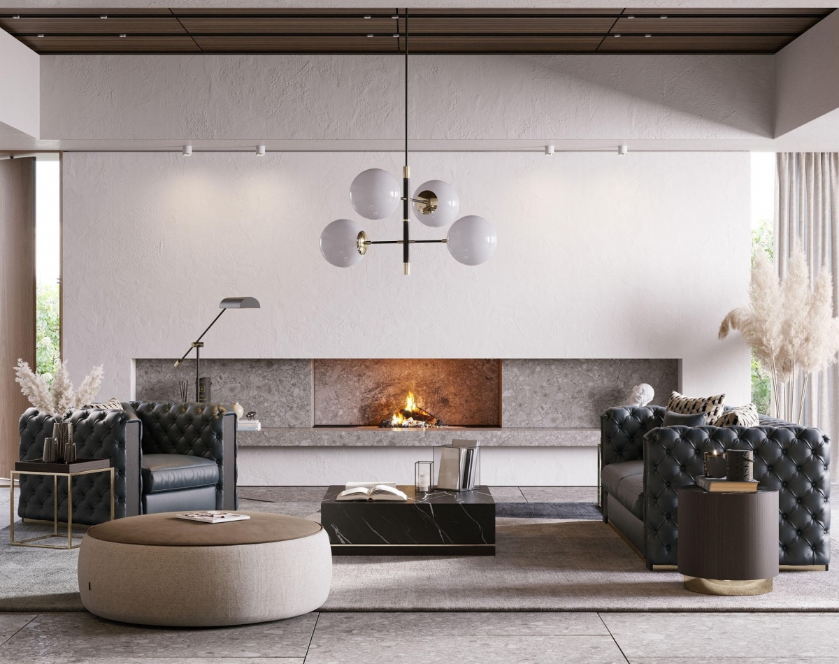 Центр притяжения в гостиной — клубное кресло и идентичный диван с простроченной графитовой обивкой и вставками цвета венге. Под стать удобной мебели трио столиков — прямоугольный кофейный из благородного мрамора на стальном каркасе, приставной квадратный с деревянной столешницей и глянцевым металлическим основанием, журнальный круглый из массива.