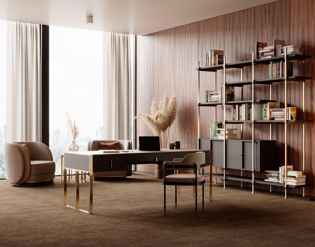 Отличную компанию стеллажу составил дизайнерский стол Allie. Благородное дерево и обильная позолота придают композиции элитарности. Тонкая столешница и аккуратные ножки стола обеспечивают интерьеру изящество, легкость.