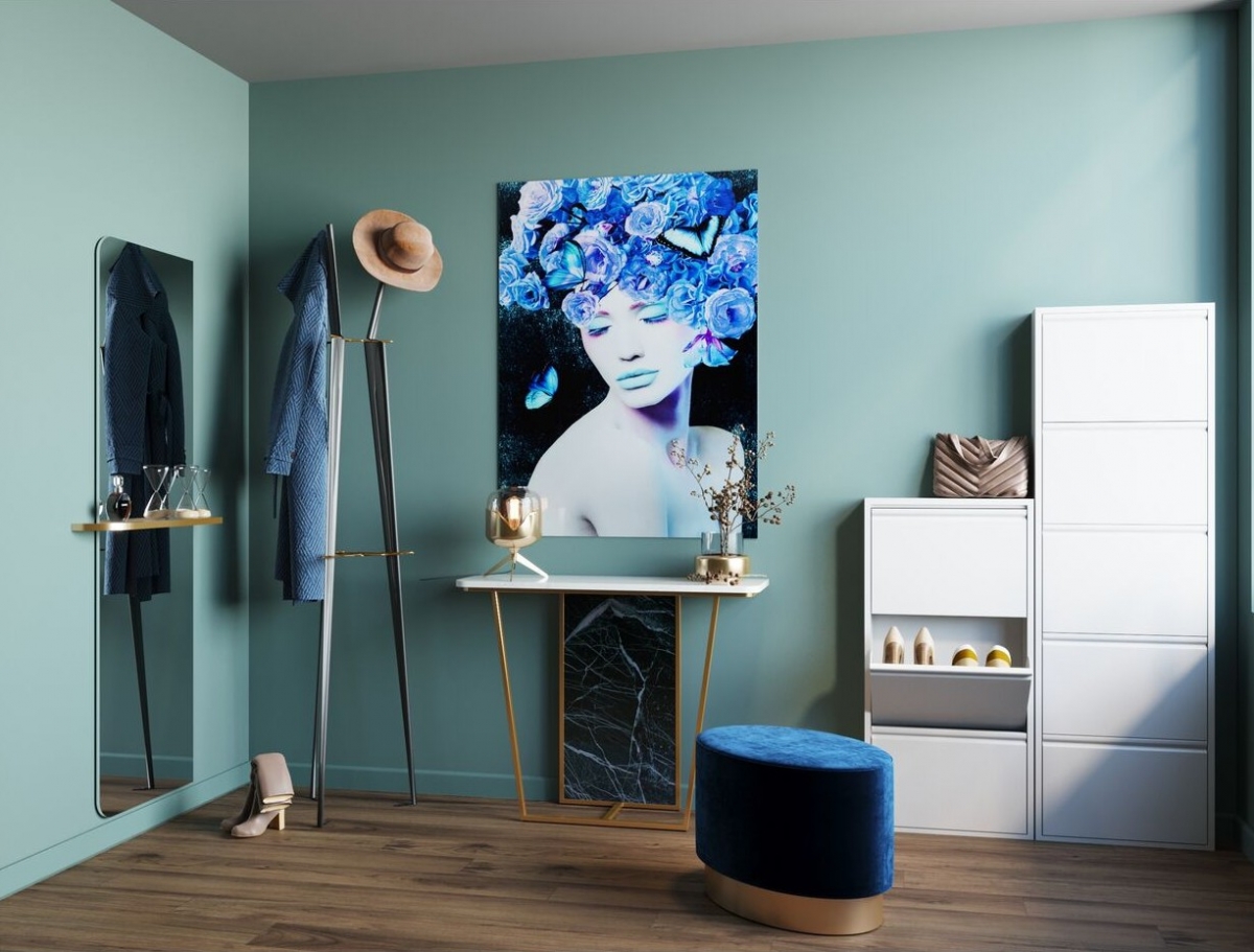Зеркало с полочкой — еще один бесценный предмет для миниатюрной прихожей. Настенная модель имеет большую высоту, поэтому рассмотреть себя перед выходом в свет не составит труда. А небольшая горизонтальная полочка служит дополнительным местом для хранения личных вещей. Стильный постер на стеклянной основе в оттенках индиго — яркая художественная составляющая лаконичного интерьера, где все практично и на своих местах.