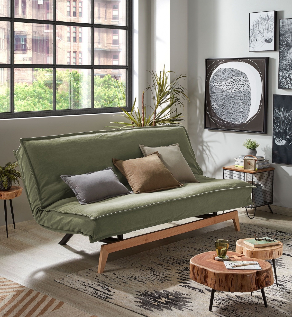 Функциональная диван-кровать Eveline вместе с подушками в чехлах Lisette и хлопковым ковром Bel образует главное сочетание этого интерьера, основанное на красоте простых линий. Мягкий текстиль в пастельных тонах делает пребывание в комнате комфортным, приятным, расслабляющим. Выразительные столики из цельных спилов стволов акации Rousy и Ryder являются настоящими изюминками этого интерьера. Несмотря на всю естественность, их облик - роскошный, оригинальный и смелый. С этими аксессуарами комната выглядит благородно, стильно и современно. Кубической формы столик Interni, несколько черно-белых постеров Calantha Dandelion и Yanick разбавляют эко-стилистику комплекта четким индустриальным мотивом, интерьер при этом остаётся гармоничным.