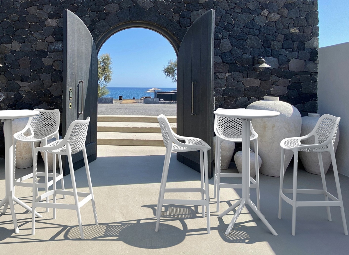 Стул на четырех высоких ножках выполнен в лаконичном дизайне с элементами геометрии, который эффектно дополняет решетчатая спинка. Он имеет твердое, но удобное сиденье. С ним идеально гармонирует белый барный стол, выполненный из того же материала в идентичной цветовой палитре. Простой, но очень привлекательный дизайн мебели создает особую летнюю атмосферу, пропитывая все вокруг теплотой солнца и летним морским бризом. Самодостаточный дизайнерский комплект из стола и стула отлично подойдет для желающих поддержать приятную праздничную атмосферу, провести романтический вечер. Элементы набора могут быть использованы как вместе, так и по отдельности. Если вы цените простоту и комфорт, то эта мебель для вас.