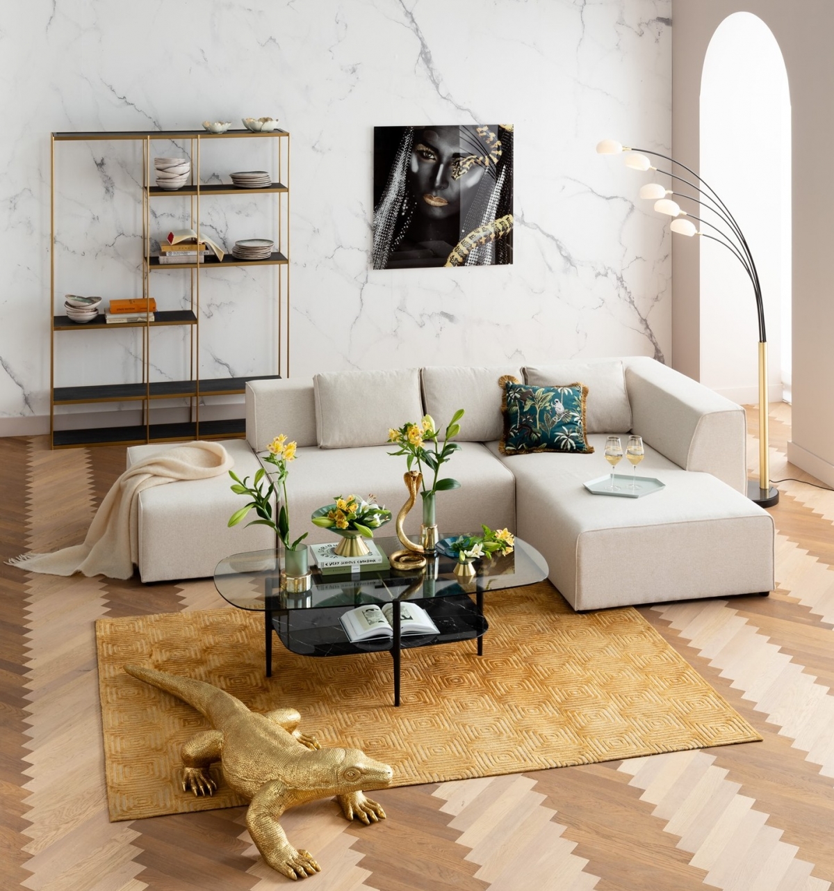 Изысканность интерьеру придают золотые декоративные фигуры рептилий, яркий вискозный ковер насыщенного медового цвета, функциональный торшер с пятеркой полукруглых плафонов из матового молочного стекла. Среди предметов меблировки центральным акцентом служит изящный кофейный столик с двумя стеклянными ярусами — прозрачным и темным. Это еще и функциональный предмет, который легко использовать для размещения сувениров, книг, статуэток и других предметов декора. Аккуратный открытый стеллаж на заднем плане гостиной комбинирует дерево полок и золотистый металл каркаса. Удобная конструкция радует своей вместимостью. Эффектный монохромный постер из стекла заполняет стену и словно «закрывает» тему высокого искусства в эстетичном интерьере для интеллектуалов.