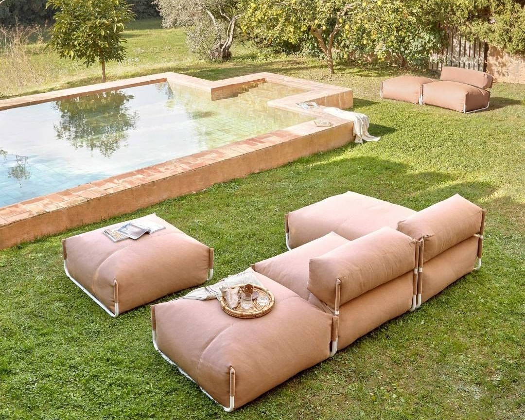 Главный приоритет минималистского стиля «в разрезе» единения с природой — большой комплект мягкой мебели. Он выполнен в нежно-розовом, почти пудровом цвете и включает лаконичное объемное кресло с большим шезлонгом, аналогичный пуф. Конструкция — модульная, дизайнерская. Можно размещать элементы по вашему усмотрению в зависимости от количества гостей, желающих расположиться около бассейна в знойный летний день.