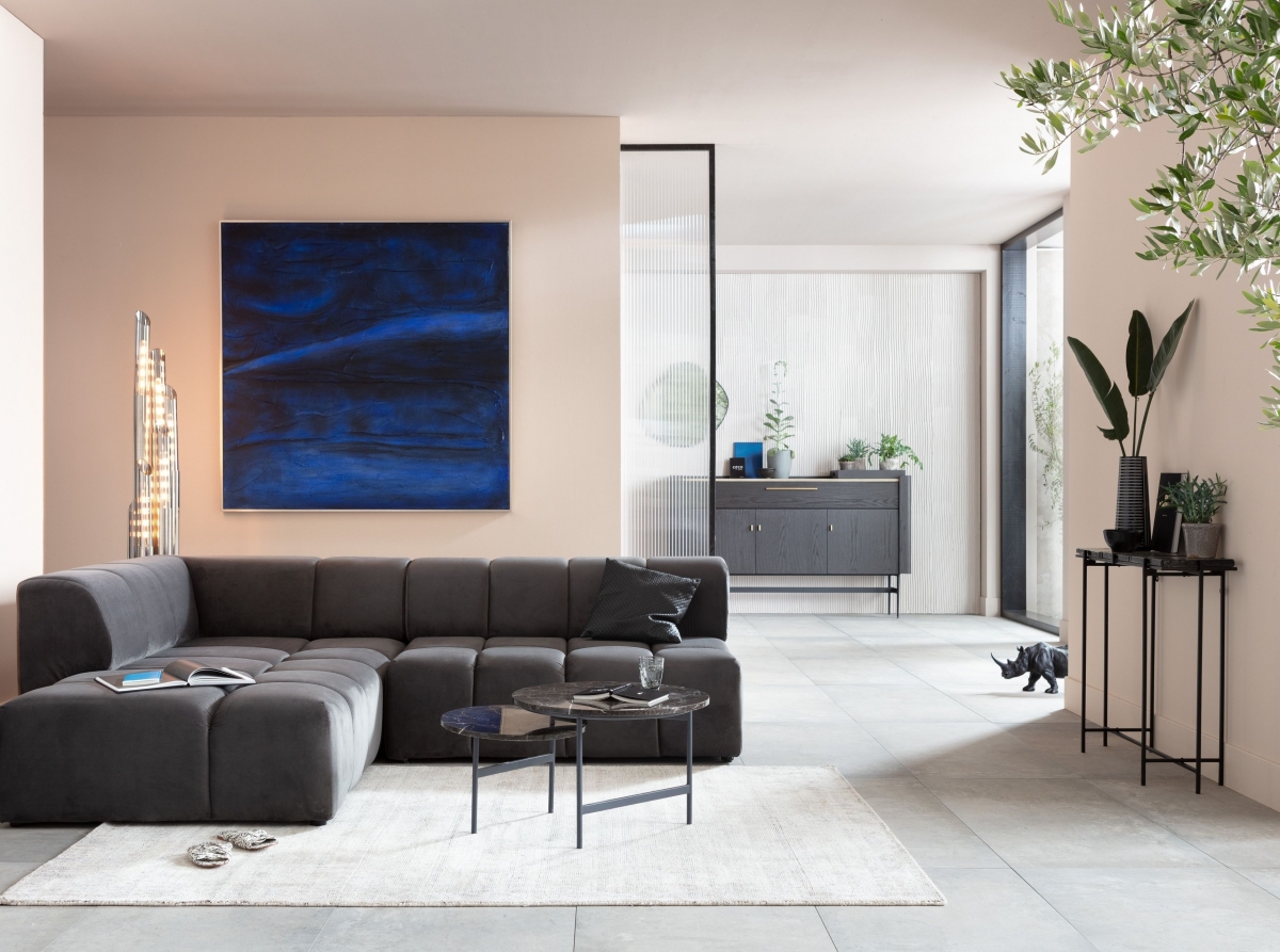 Мягкий угловой диван, столик-траснформер со столешницей под мрамор, стильная консоль с эффектной столешницей, барный комод, оригинальный торшер из стекла и эффектная картина гармонично дополняют друг друга и создают уютную домашнюю обстановку.