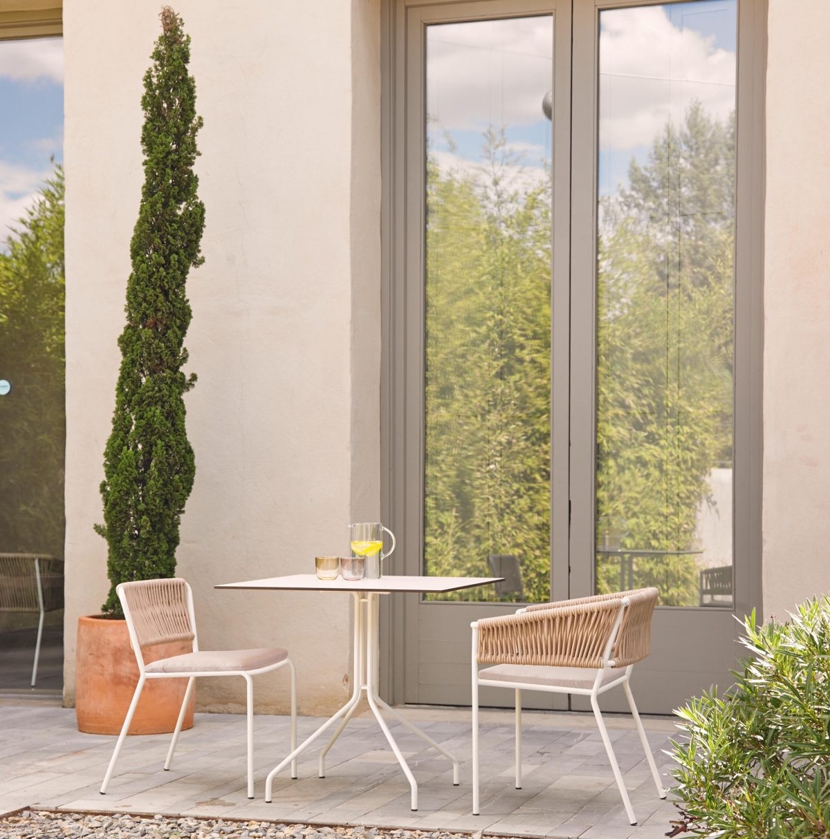 Тихо и ненавязчиво в интерьере выглядит основная мебельная группа. Он представлена всего лишь парой стульев и небольшим столом. Последний имеет лаконичную и практичную столешницу из пластика, затейливо выгнутые ножки. Он выполнен в классическом белом цвете. А стулья совмещают металлические каркасы и плетеные спинки — полукруглую и прямоугольную.