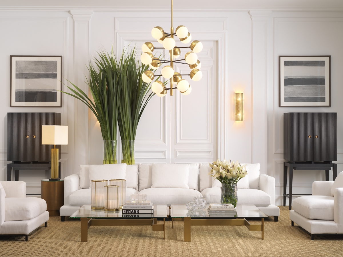 Белоснежно-золотой люкс — в этом интерьере все «драгоценные» грани виртуозно и гармонично переплетаются друг с другом. Эффектная и эстетичная гостиная без лишних оттенков и контрастов выглядит празднично и солидно одновременно. Просторная и светлая комната — идеальный вариант для жизнерадостных, ярких людей, которые не скрывают эмоций в жизни, но не терпят хаоса в своем доме.