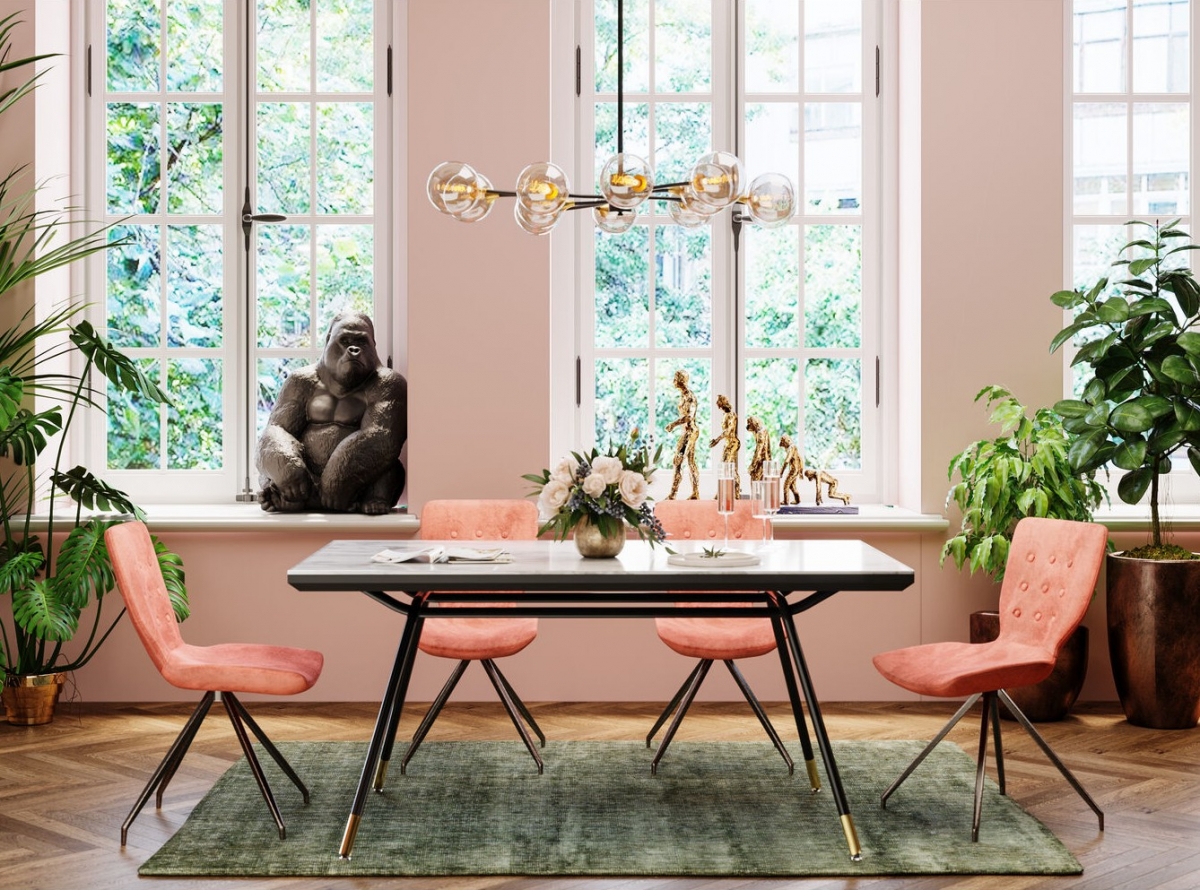 Интерьер помещения оформлен в ярких палитрах. Направлению присущ эффект легкости и простоты, но вместе с тем – и максимального комфорта. Приверженность северным мотивам прослеживается в больших окнах, светлых тонах стен и натуральных материалах. Обстановка в комнате прекрасно вписывается в идею стиля – практичный стол оригинального дизайна, окруженный мягкими стульями, вкупе с хлопковым ковром создают атмосферу гостеприимности и домашнего уюта. Гармоничным дополнением интерьера выступают замысловатый потолочный светильник, живые растения и броские элементы декора – статуэтка и фигура гориллы, расставленные на подоконниках.