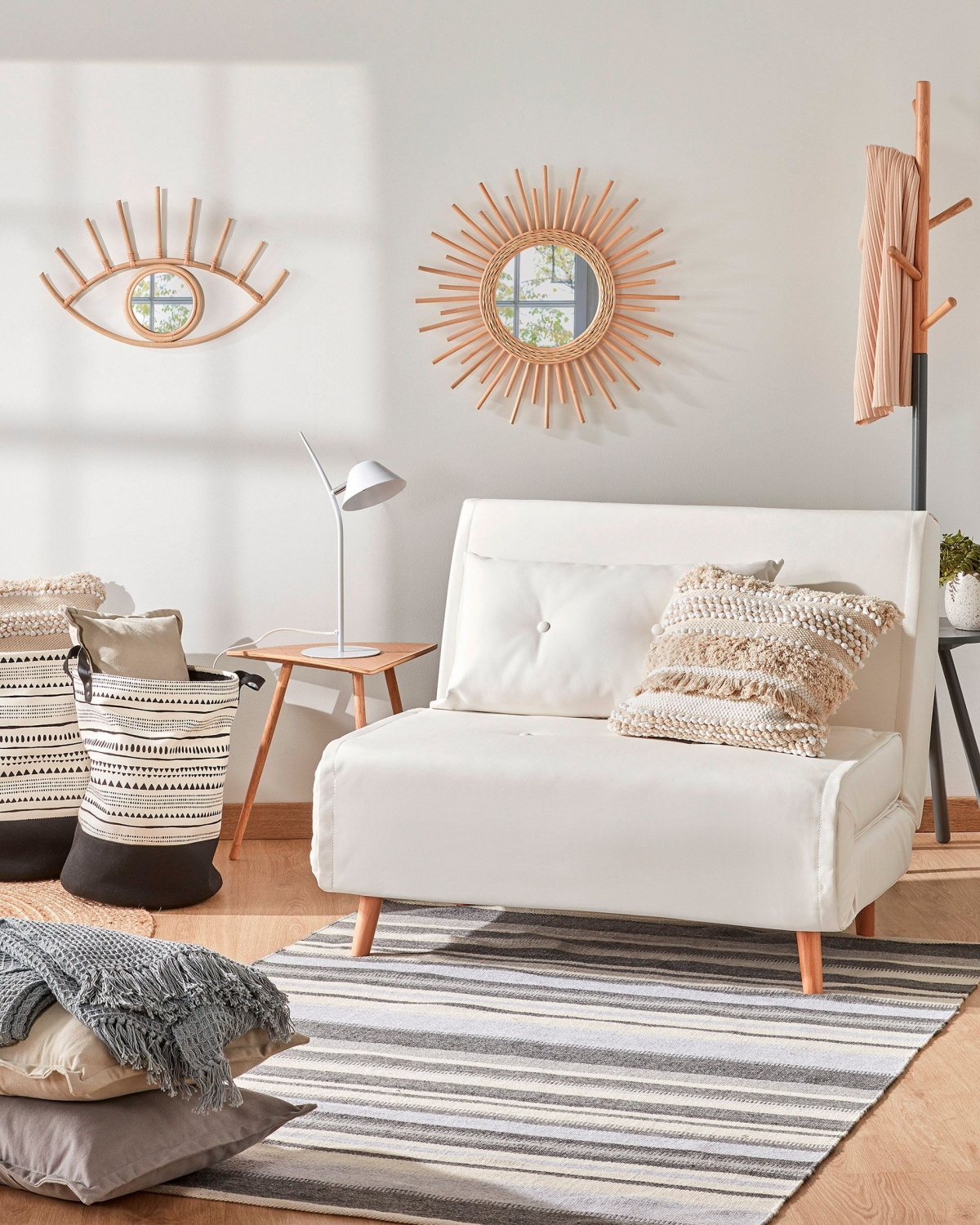 Главный акцент этого помещения - детали из натуральных материалов: ротанговые зеркала на стене, вспомогательный столик из дерева, вешалка в виде ствола с ветвями. Фоном им служит белая кровать-диван. Компактная и современная, она сочетает в себе мягкость и лаконичность. Это идеальный вариант для небольших помещений - в сложенном виде кровать занимает совсем немного места. В цвет кровати подобрана простая белая настольная лампа. Она не отвлекает на себя внимание, но в то же время дополняет мебельный ансамбль.
