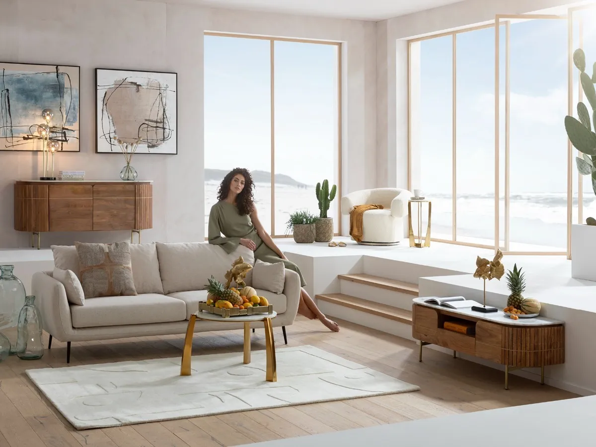 Лёгкий, изысканный интерьер в скандинавском стиле естественный, как сама природа. В нём нет ничего кричащего. Вся мебель выполнена в мягких, натуральных тонах. В дизайне прослеживается датское направление, сформировавшееся под влиянием традиций неоклассики и модерна. Комод и тумба, изготовленные вручную, являются поистине уникальными. Фасады из древесины манго и мраморные столешницы придают им особый шик, изящество.