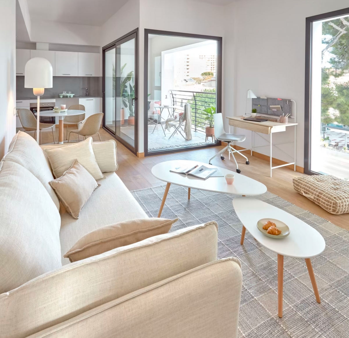 Минимализм, лаконичность, легкость и изящность, простота и сдержанность - основные качества представленного интерьера в скандинавском стиле. В соответствии с ним, помещение делится на зоны для отдыха и работы, кухню, уютный балкон. Белый, серый и бежевый цвета гармонично сочетаются друг с другом, выступая вечной классикой, а большие панорамные окна обеспечивают высокий уровень освещенности и визуально расширяют пространство. Соответствующие стилю минималистичные аксессуары в светлых тонах - торшеры, посуда, органайзер для рабочего стола и подушки выступают "изюминкой" интерьера.