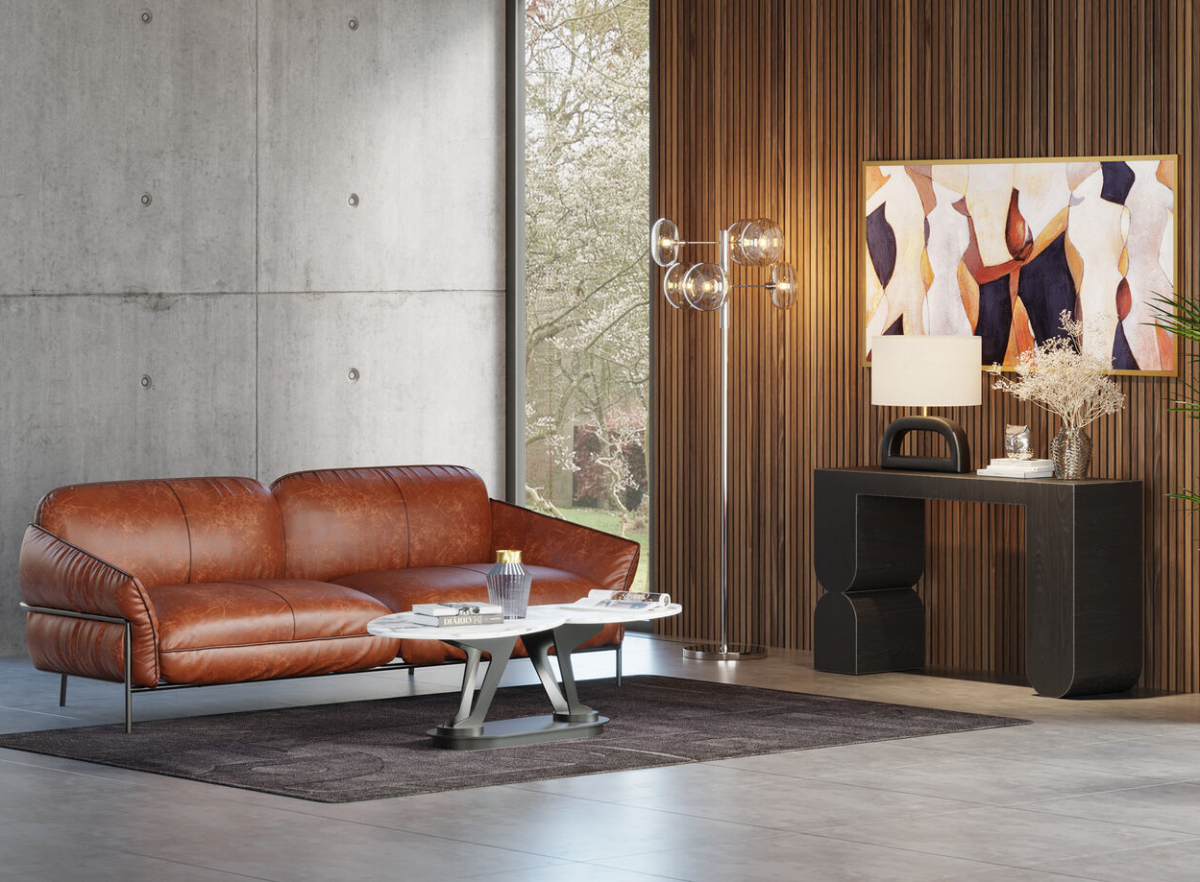 Центральным предметом интерьера выступает диван, выполненный из ДСП и фанеры. Стальные лакированные ножки, воловья кожаная обивка и пружинистая основа позволят приятно провести время и отдохнуть за чтением книг.