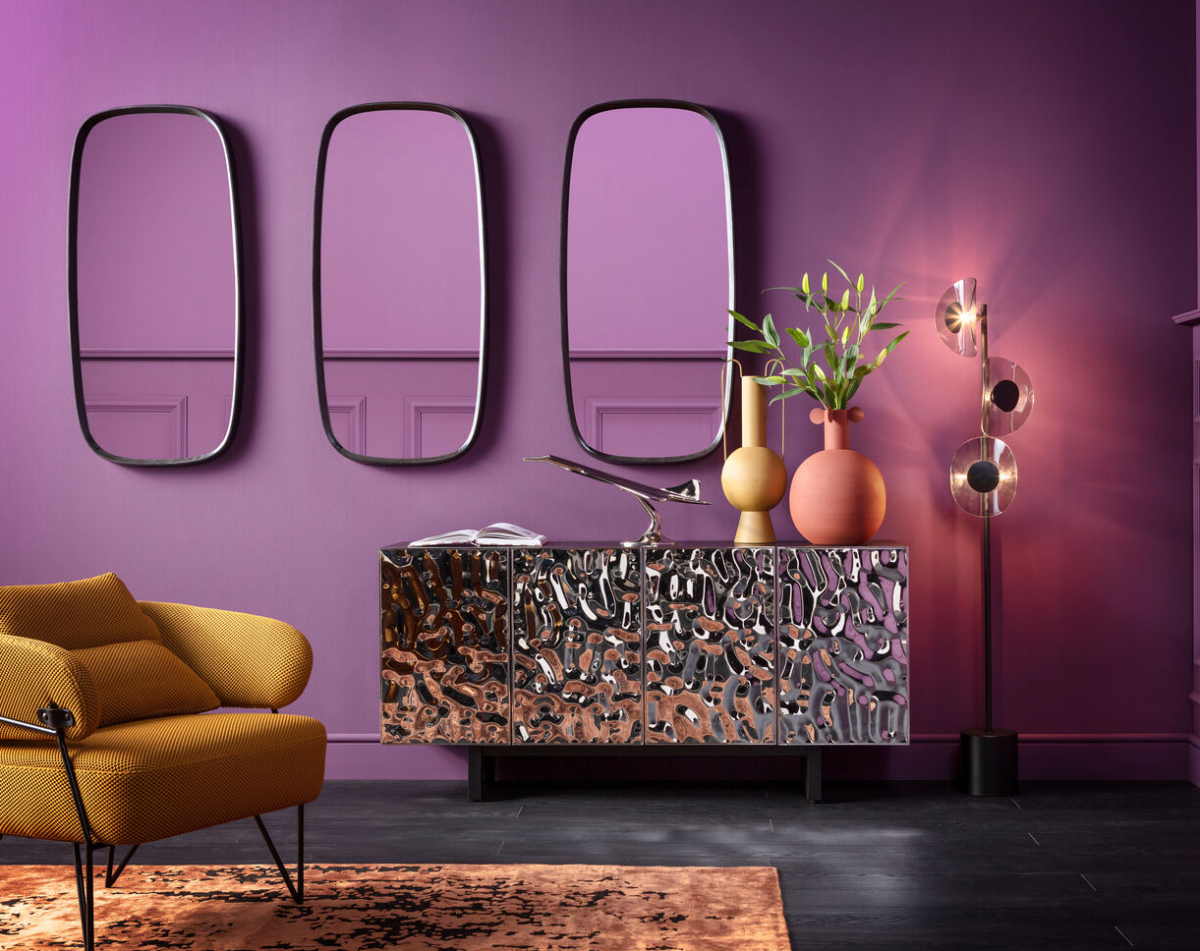 Рассеянный свет направленных в разные стороны плафонов торшера, отражающийся в трёх зеркалах, за счёт игры теней создаёт в гостиной фантастическую атмосферу, а уют обстановке придают 2 вазы оригинальной формы, статуэтка самолёта Concorde и мягкий ковёр из вискозы тёплого, кофейного цвета.