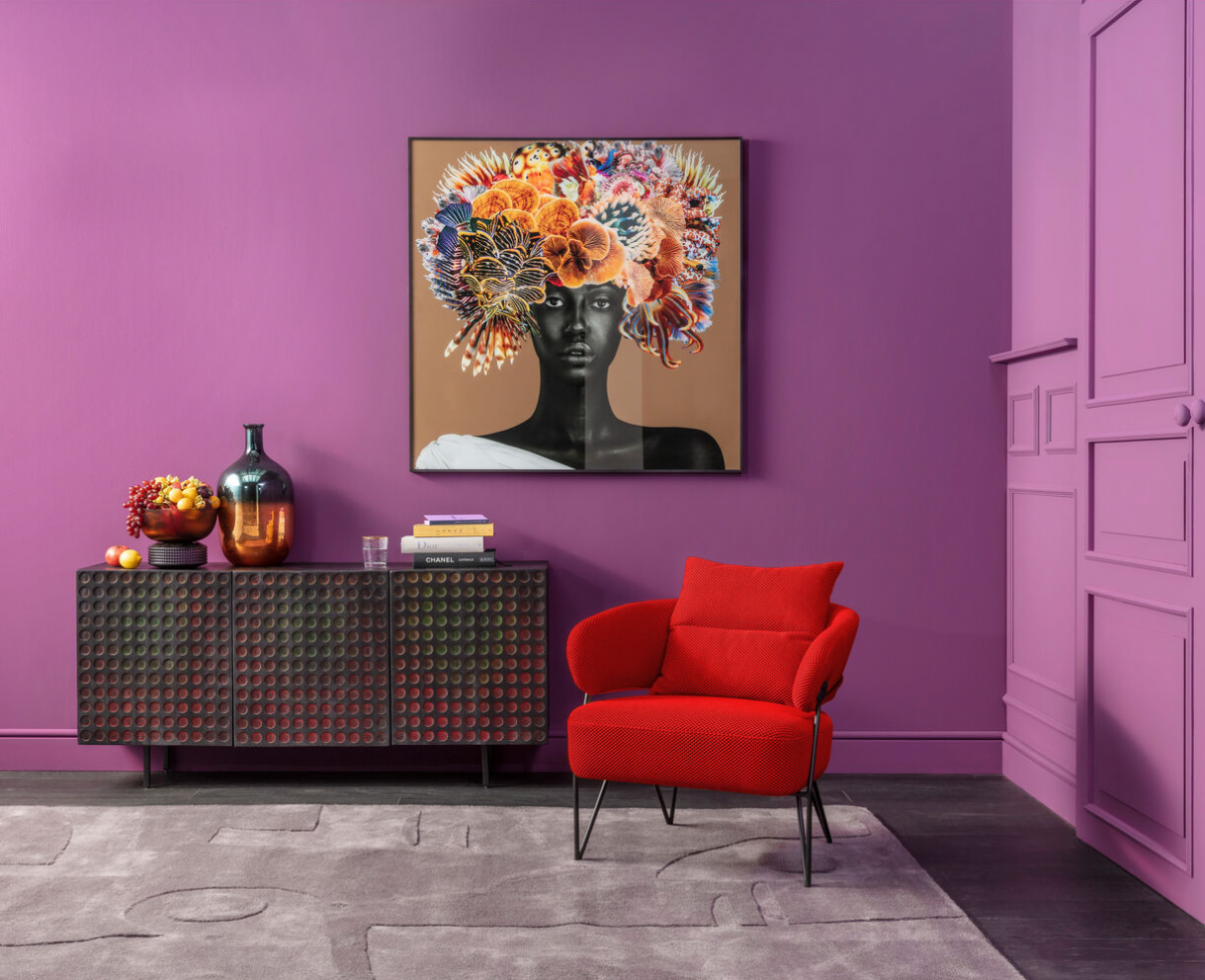 Дерзкий, яркий интерьер гостиной в стиле авангард словно специально создан, чтобы эпатировать, удивлять окружающих. Он никого не оставит равнодушным. В нём гармонично сочетаются смелые, новаторские идеи дизайна. Кресло с красной обивкой смотрится особенно выигрышно рядом со стенами глубокого фиолетового цвета, а большая картина с изображением необычной женщины из экваториальной страны с экзотическим головным убором не затеряется на фоне мебели.