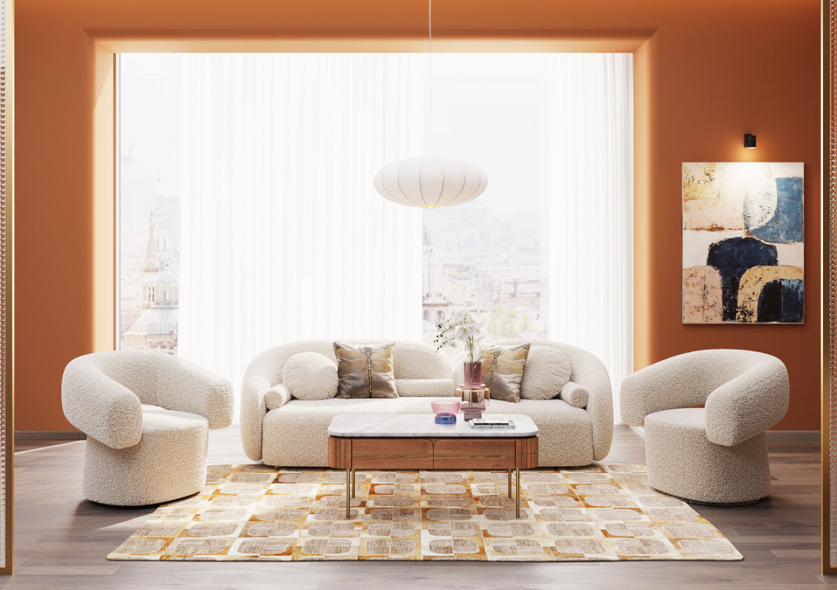 Несмотря на то, что годы расцвета модерна приходятся на конец XIX века, он и в XXI веке не стал менее популярен. В оформлении дизайна интерьера используются приёмы, характерные для этого направления. Кофейный столик выполнен из ценной породы дерева – массива манго. У дивана, кресел и столика плавные, загнутые края. Подушки декорированы изображением стрекоз, стену украшает картина с оригинальным абстрактным рисунком.