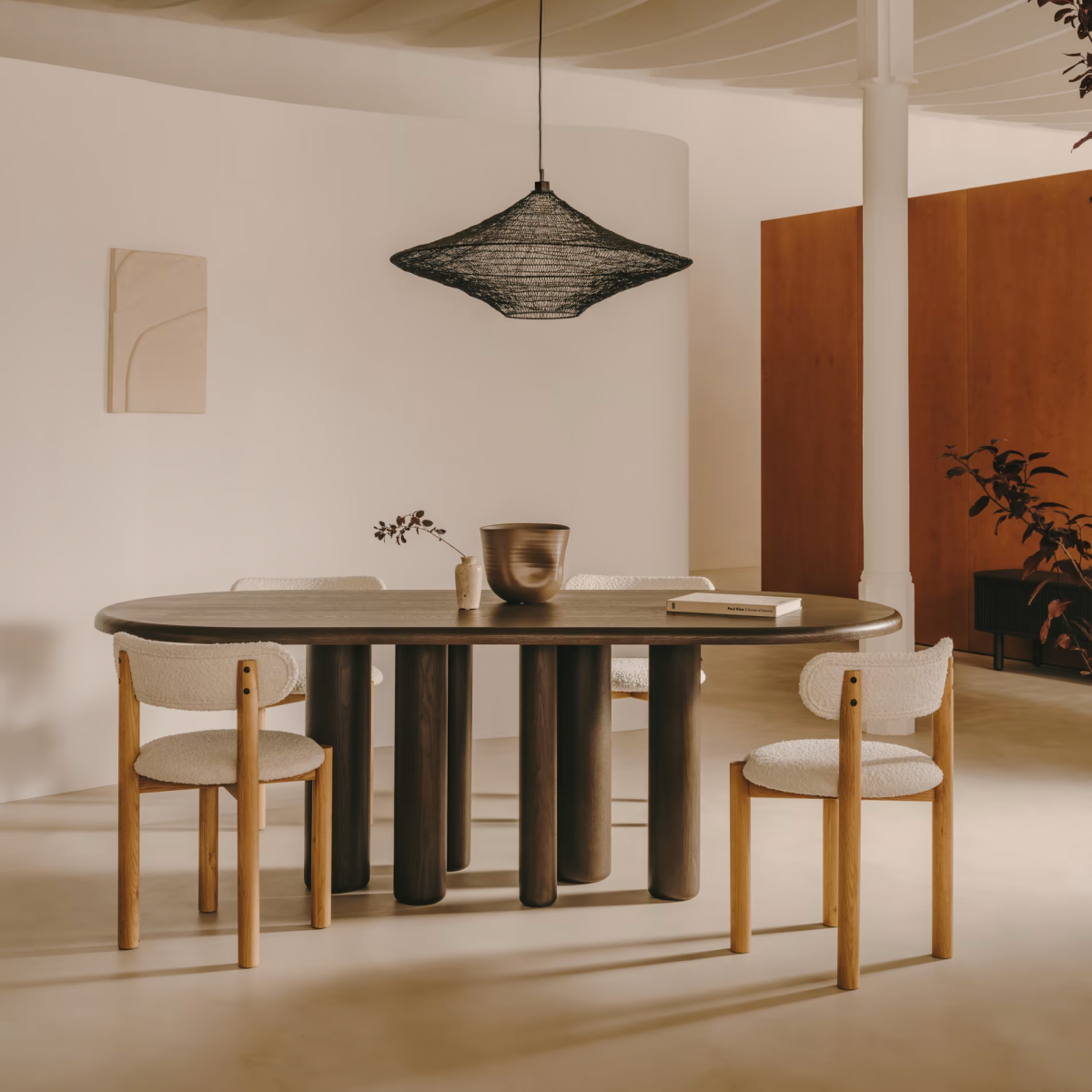 Мебель изготовлена из натуральных материалов: стол – из ясеневого шпона, стулья – из массива дуба. Все предметы выдержаны в оттенках коричневого, естественных для древесины, с которыми органично сочетается белая обивка стульев из мягкой, приятной наощупь ткани букле.
