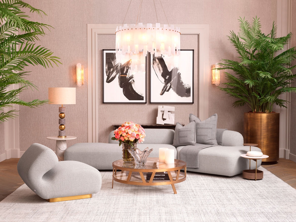 Интерьер помещения оформлен в традициях арт-деко с поправкой на комфорт и современность. Направлению присуще сочетание роскоши, натуральности материалов и мягких цветовых оттенков. В интерьере черты стиля прослеживаются по декоративным стеновым панелям, паркетному полу и ковру из хлопка. Важнейшим дополнением служат предметы меблировки – замысловатые по дизайну и удобные в эксплуатации диван и кресло, изящные круглые столики. Отдельное внимание в арт-деко уделяется изобилию элементов подсветки – в комнате эта идея воплощена при помощи роскошной люстры Pizzorni, замысловатой в исполнении настольной лампы Levy и двух бра Ginnis. Атмосферу уюта и комфорта подчеркивают предметы декора в виде мягких подушек и пледа, броского кашпо с зеленым растением, винтажного диптиха и изысканного декоративного элемента из мрамора.